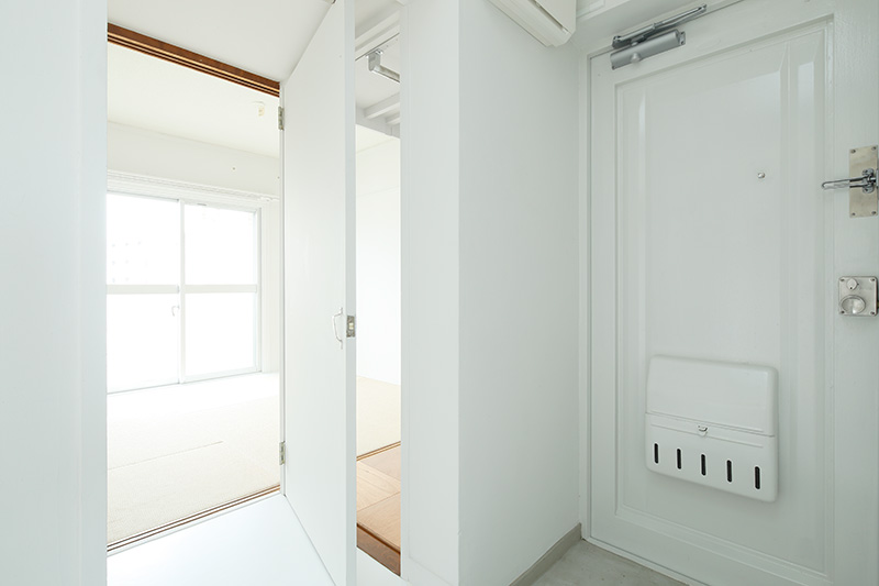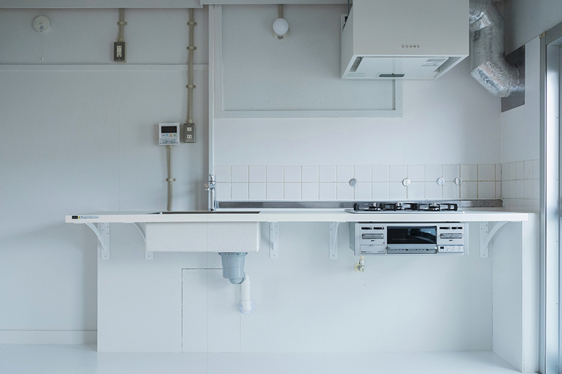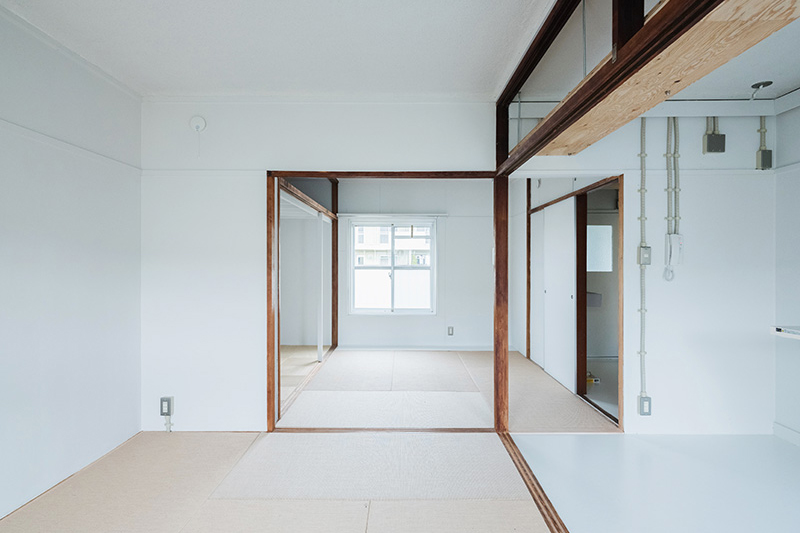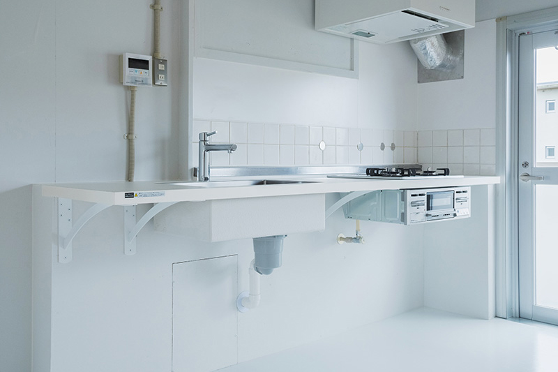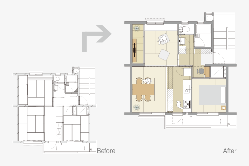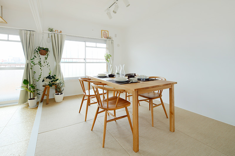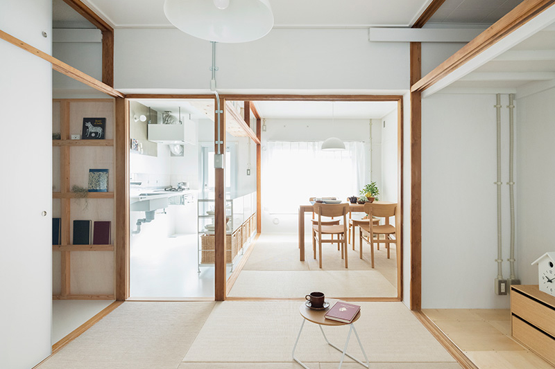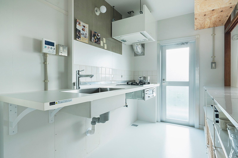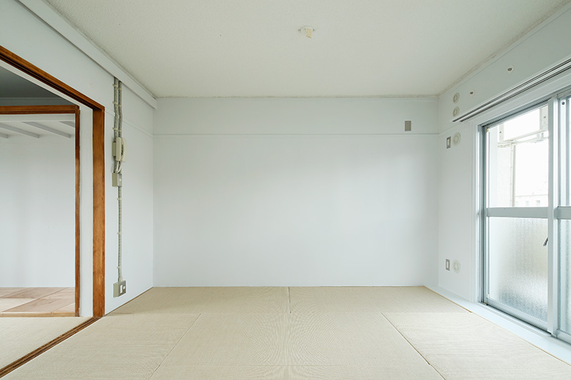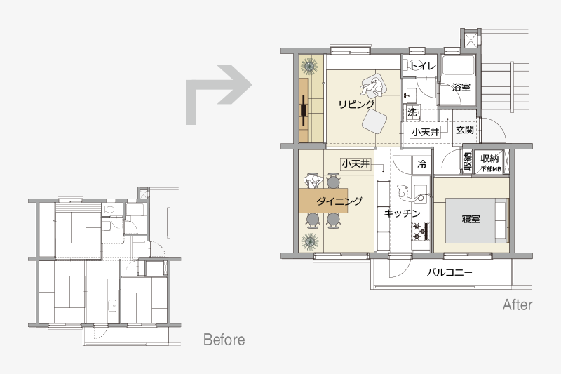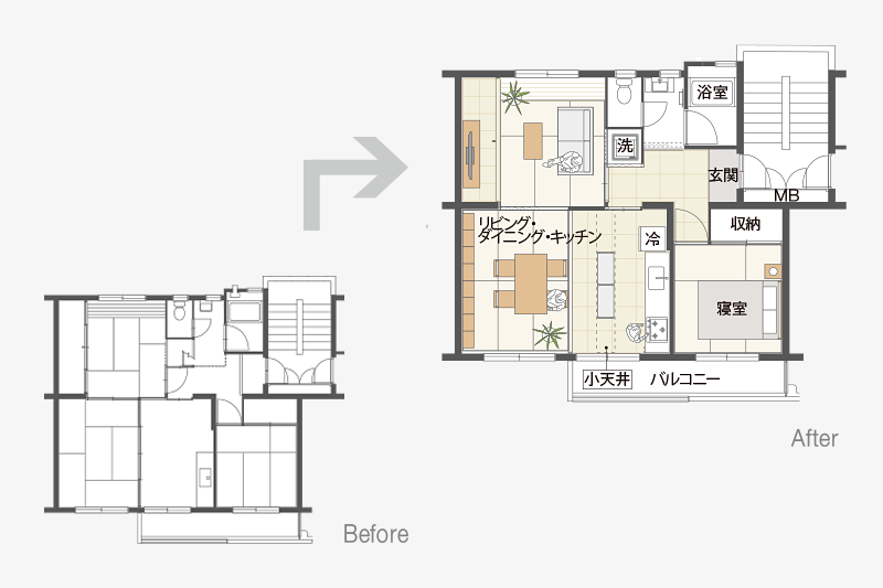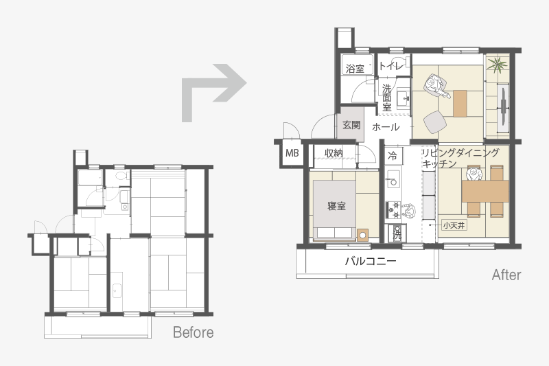 壁付けにキッチンを新設することでバルコニー面の広さを確保しました。また南北を隔てる壁や押入の中棚を撤去して部屋の一部として解放し、南北につながる広々としたLDK空間としました。