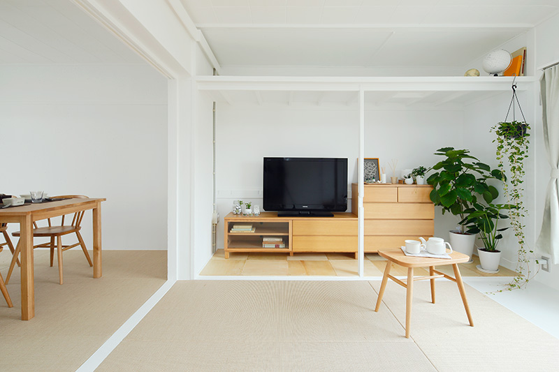 ダイニングとつながったリビングでは南北に光と風が通り抜けます。元押入部分も部屋の一部とすることで、広々としたリビングでくつろぐことができます。