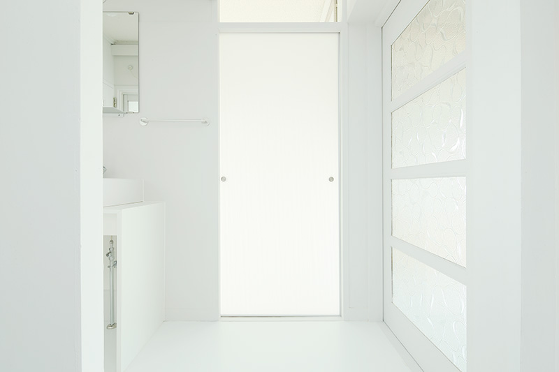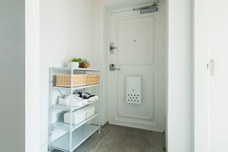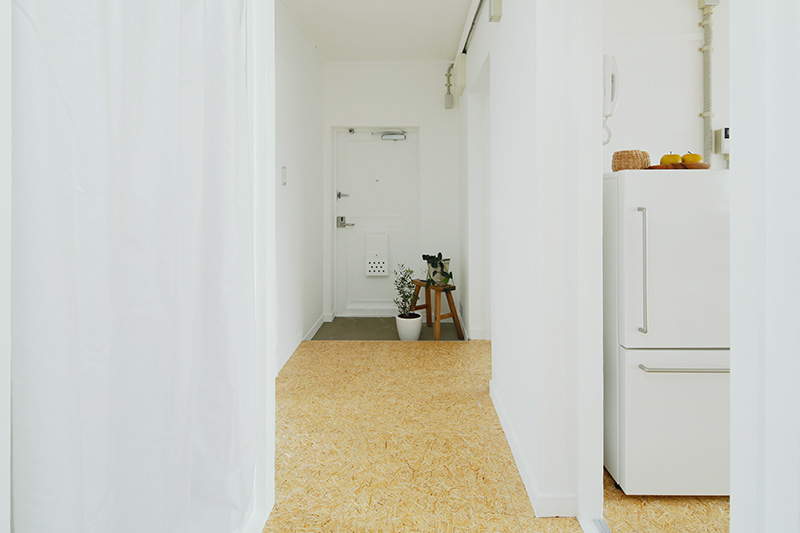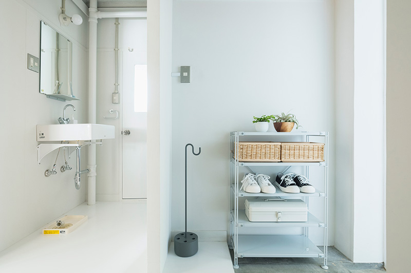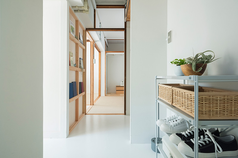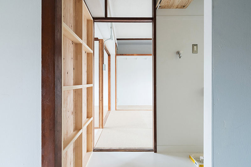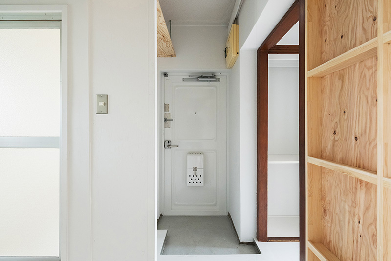 冷蔵庫置場を確保するために新たに建てた壁の木軸を利用して、壁面棚としました。玄関ホールの狭い空間を有効活用できます。