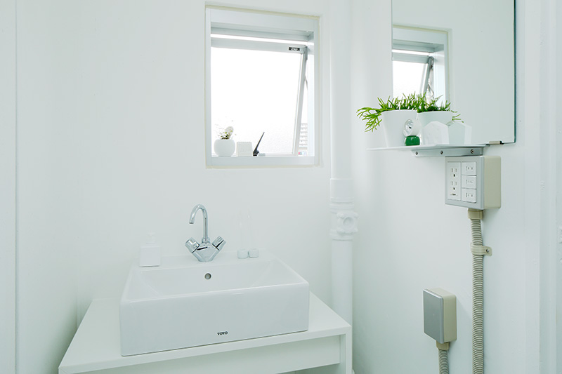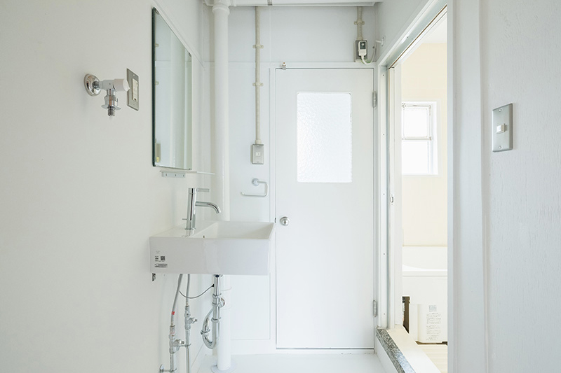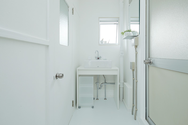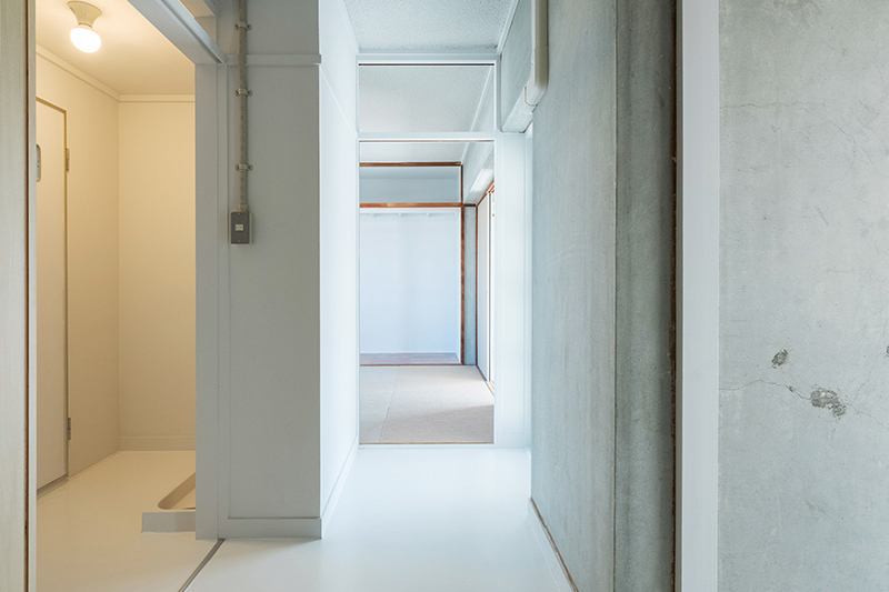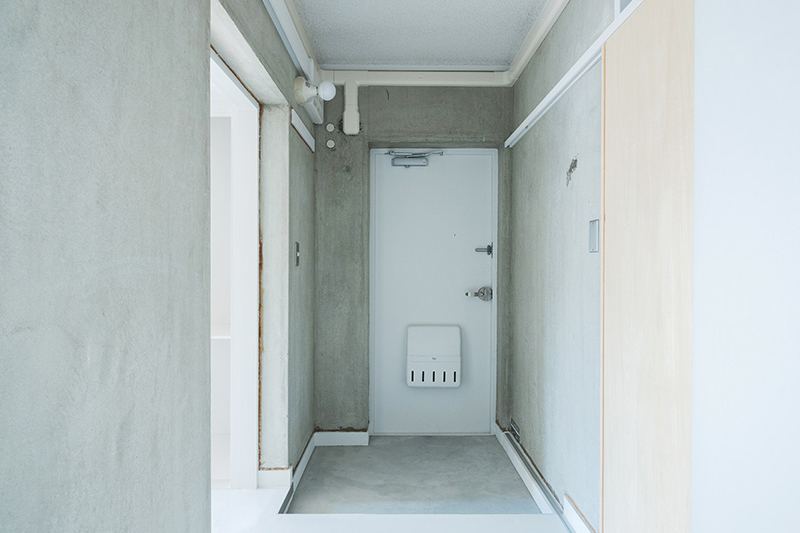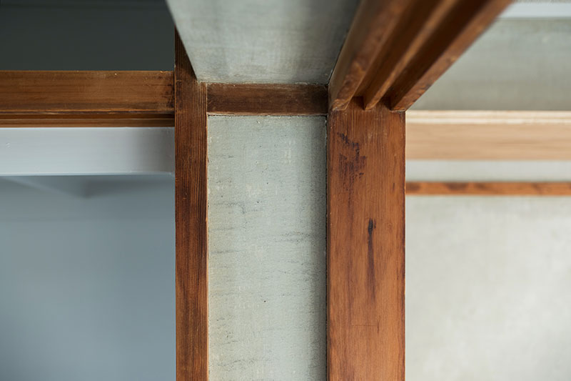 もともと壁紙が貼られていた壁を丁寧に剥がしてコンクリートの素地を表しにてし仕上げ、木部もそのまま素地を生かしました。
