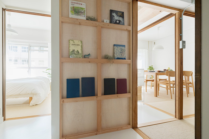 廊下の木軸壁を利用して壁面本棚を設置しました。狭い空間の中で壁面を有効活用できるようになっています。