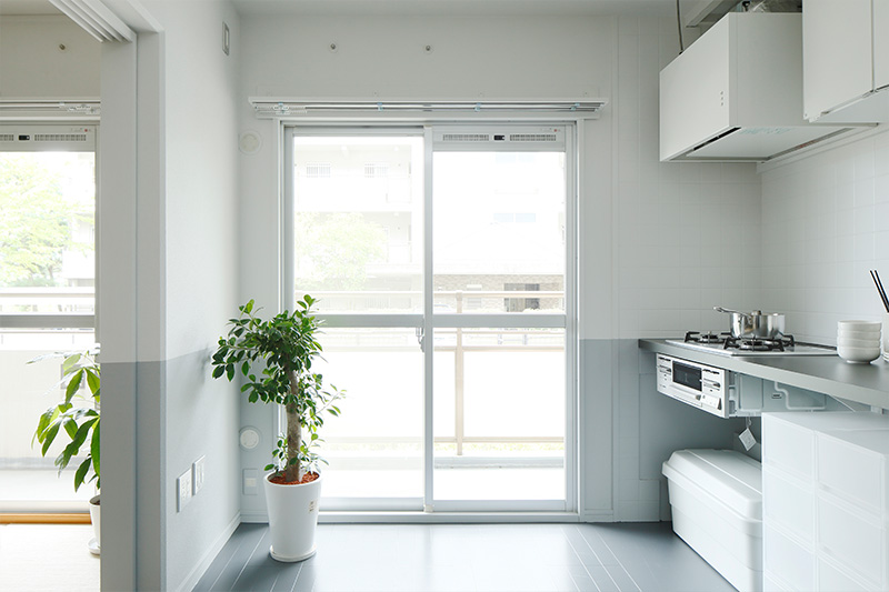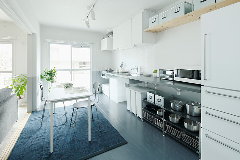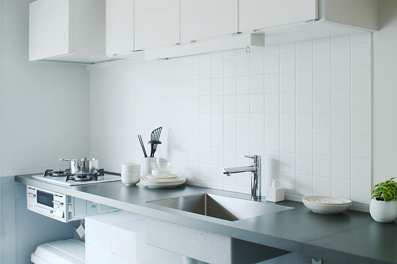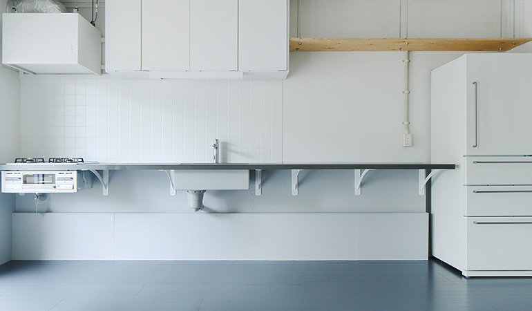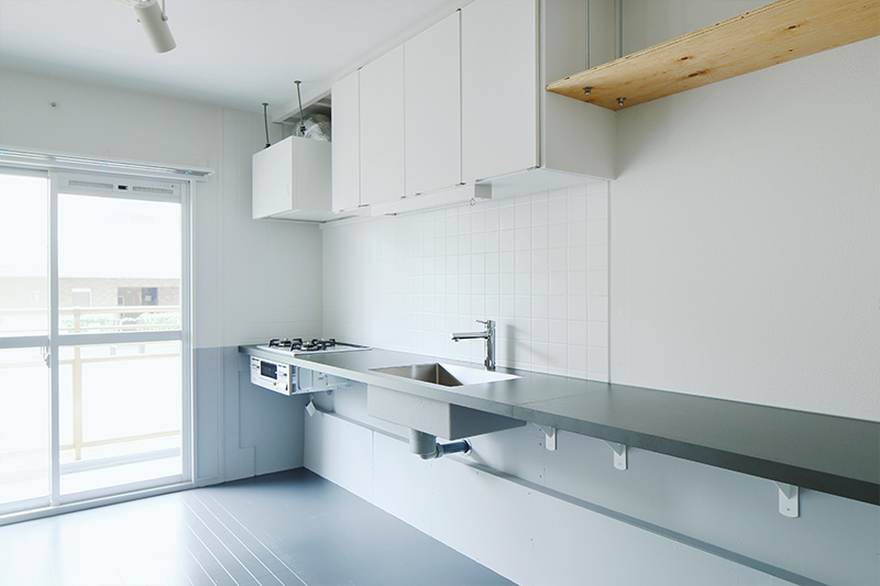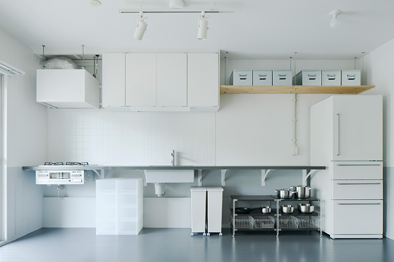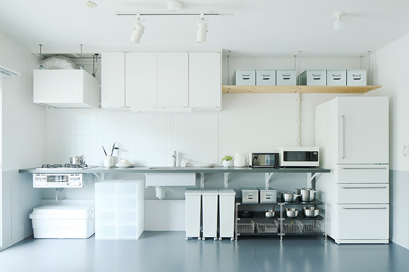 長さ3.7mのロングカウンターキッチンには吊り戸棚を設置。充実した作業スペース、収納スペースを確保します。