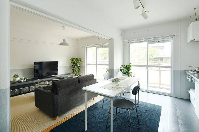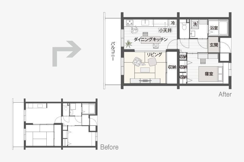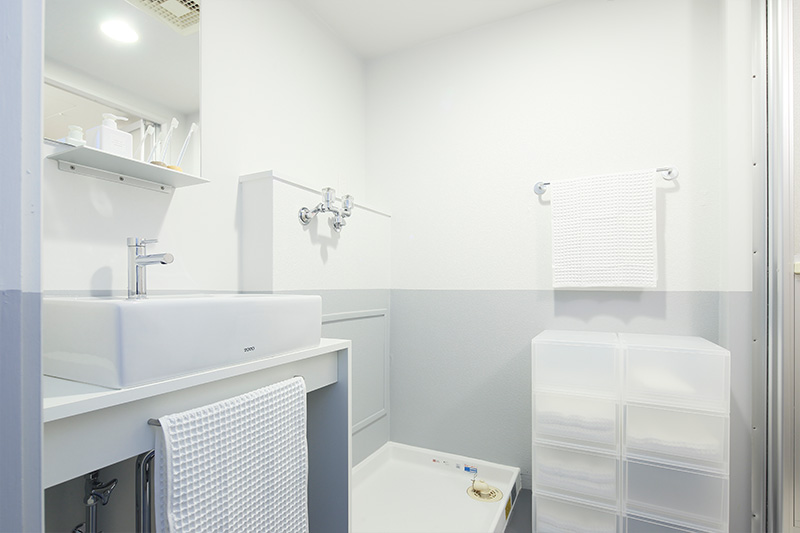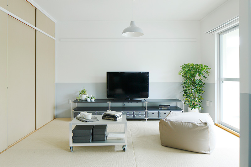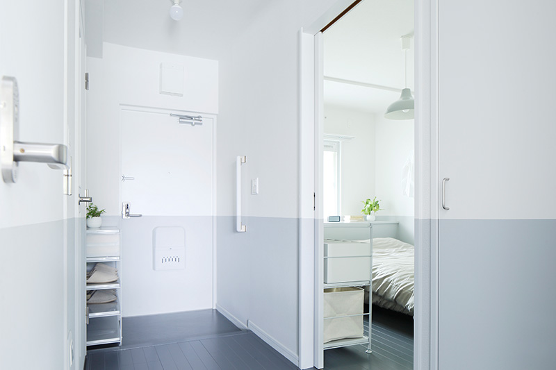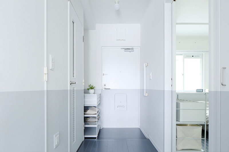 空間の広がりを意識し、グレートと白を使って、下から上へ明るくなるよう配色しています。