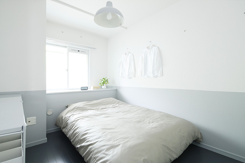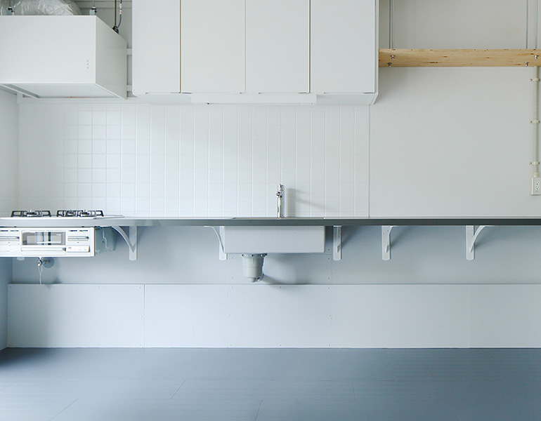 床は濃いグレー、壁は下が薄いグレー、上は白と徐々に明るくすることで、上に向かって空間の広がりをつくっています。