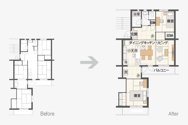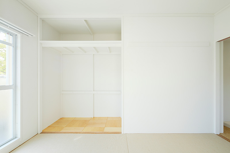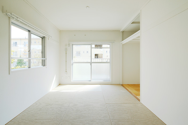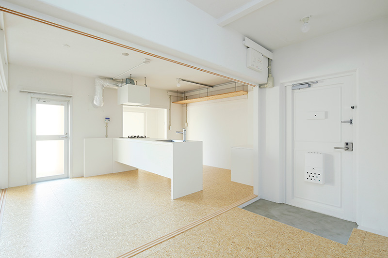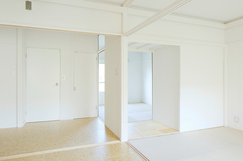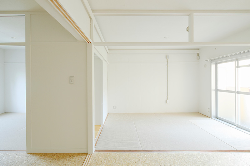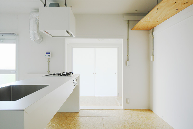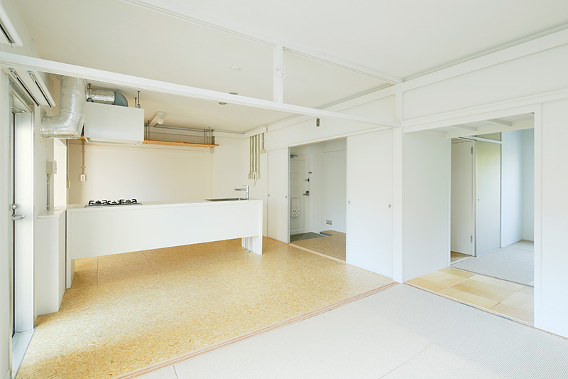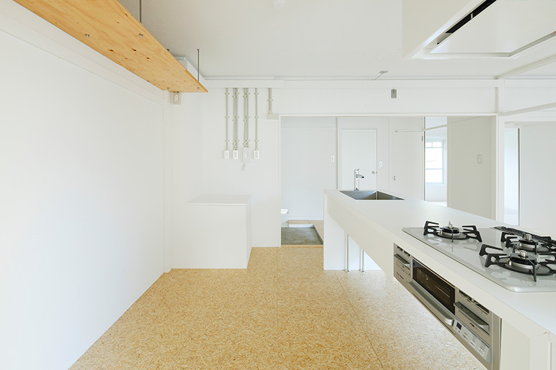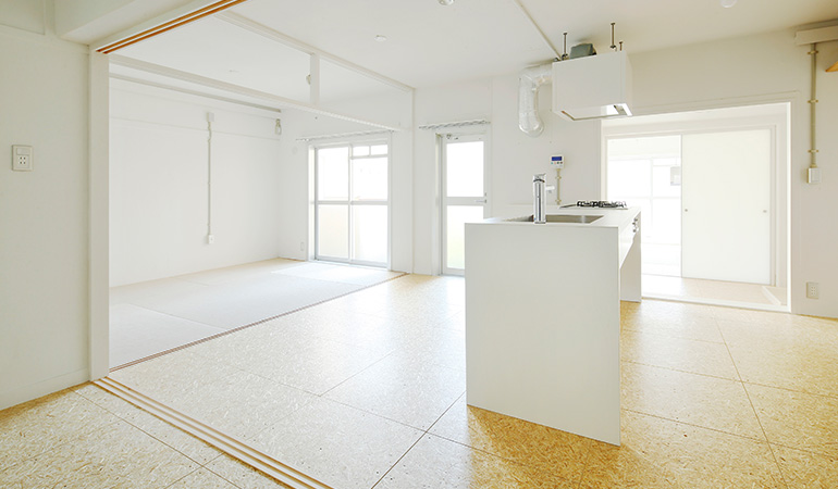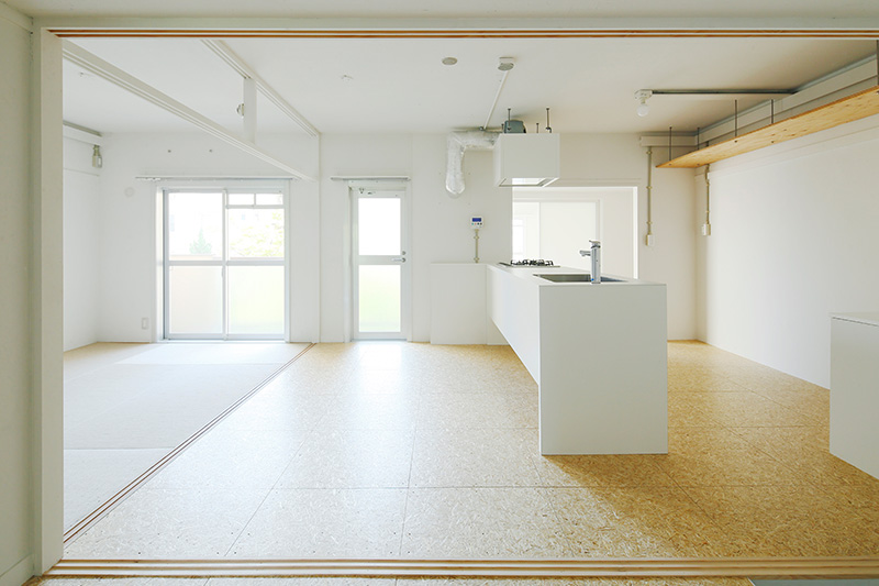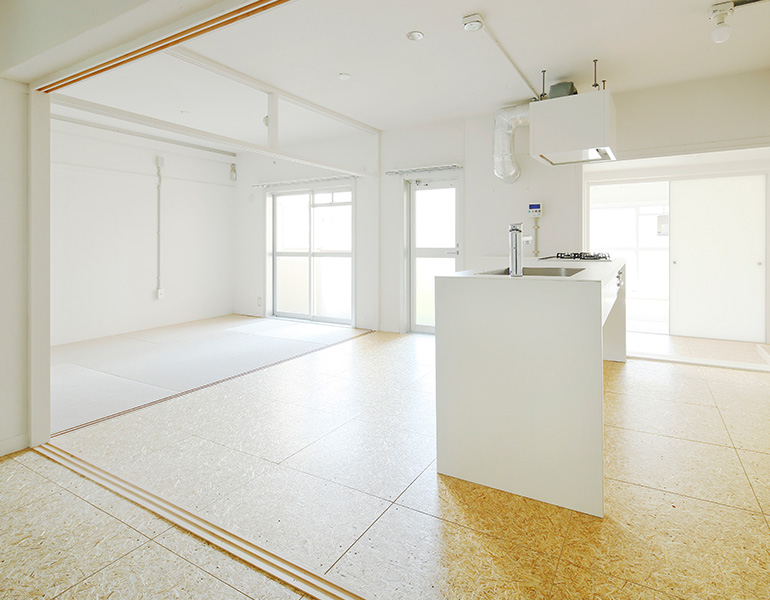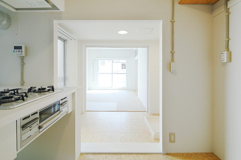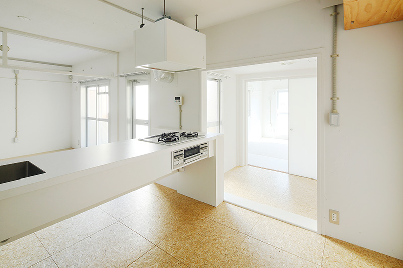 対面式キッチンからは、部屋中を見渡すことができます。押入だった空間を開放することでリビングから寝室まで光と風が通り抜けます。