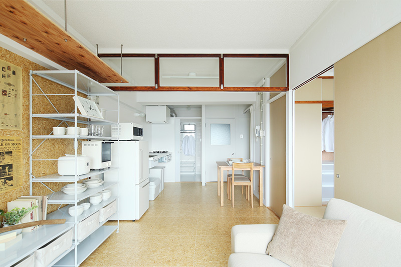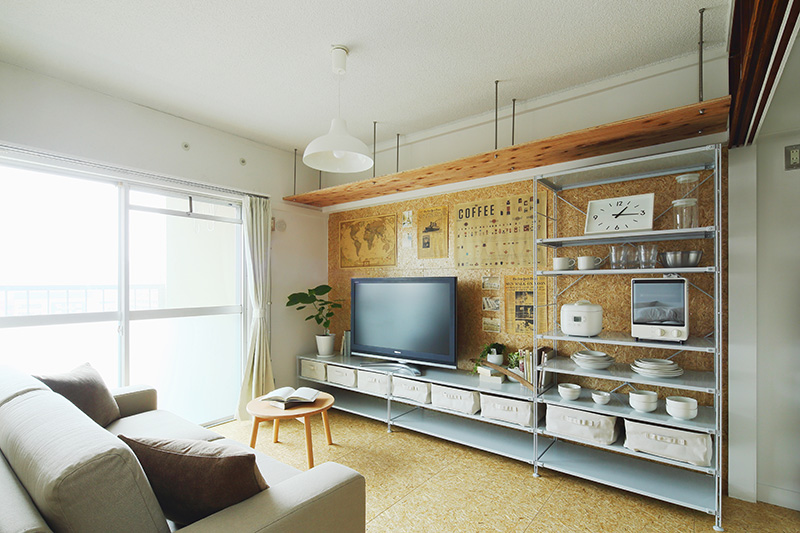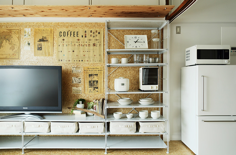 小天井と同じ合板でできたフリーアレンジウォールを設置しました。ポスターや小物をピンやビスで自由に壁に付けることができます。