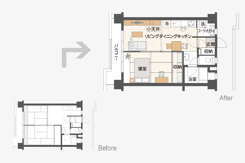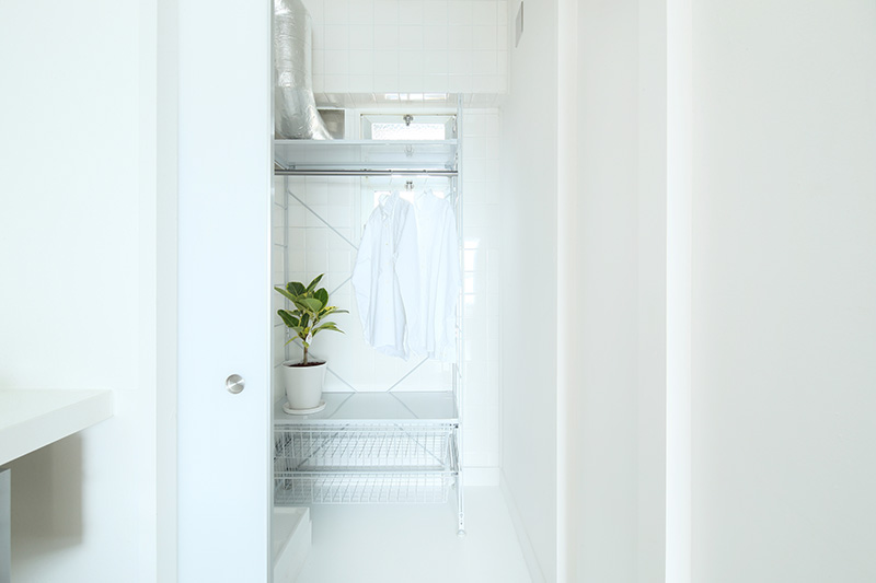 キッチンのすぐ横にユーティリティスペースをつくり、効率的な家事動線を確保しました。