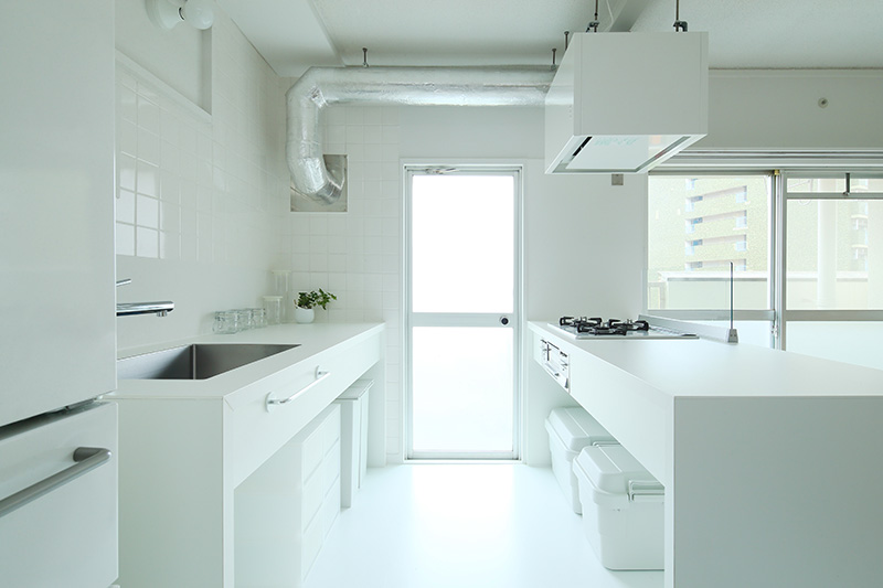 2列型のキッチンを配置することで充実した作業スペースを確保しました。バルコニーからたっぷりと光が差し込む明るいキッチンとなりました。