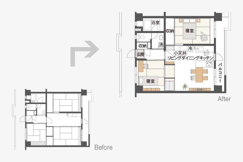 寝室とLDKの間の収納のふすまを取り外すことで、広々としたLDK空間として使うこともできます。