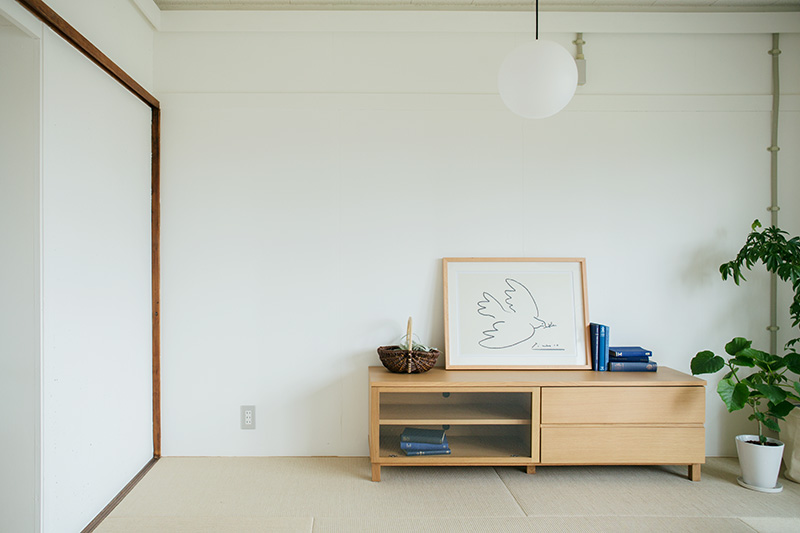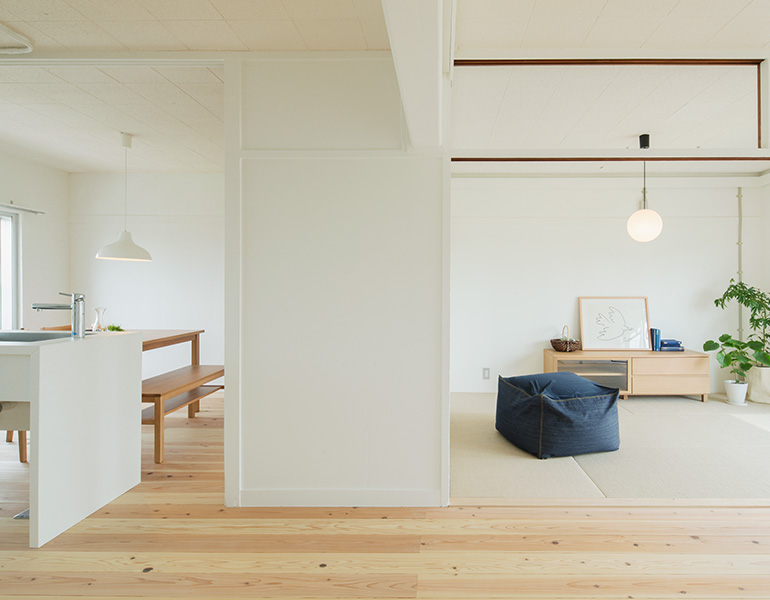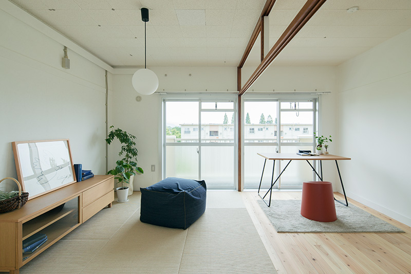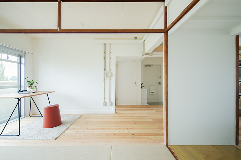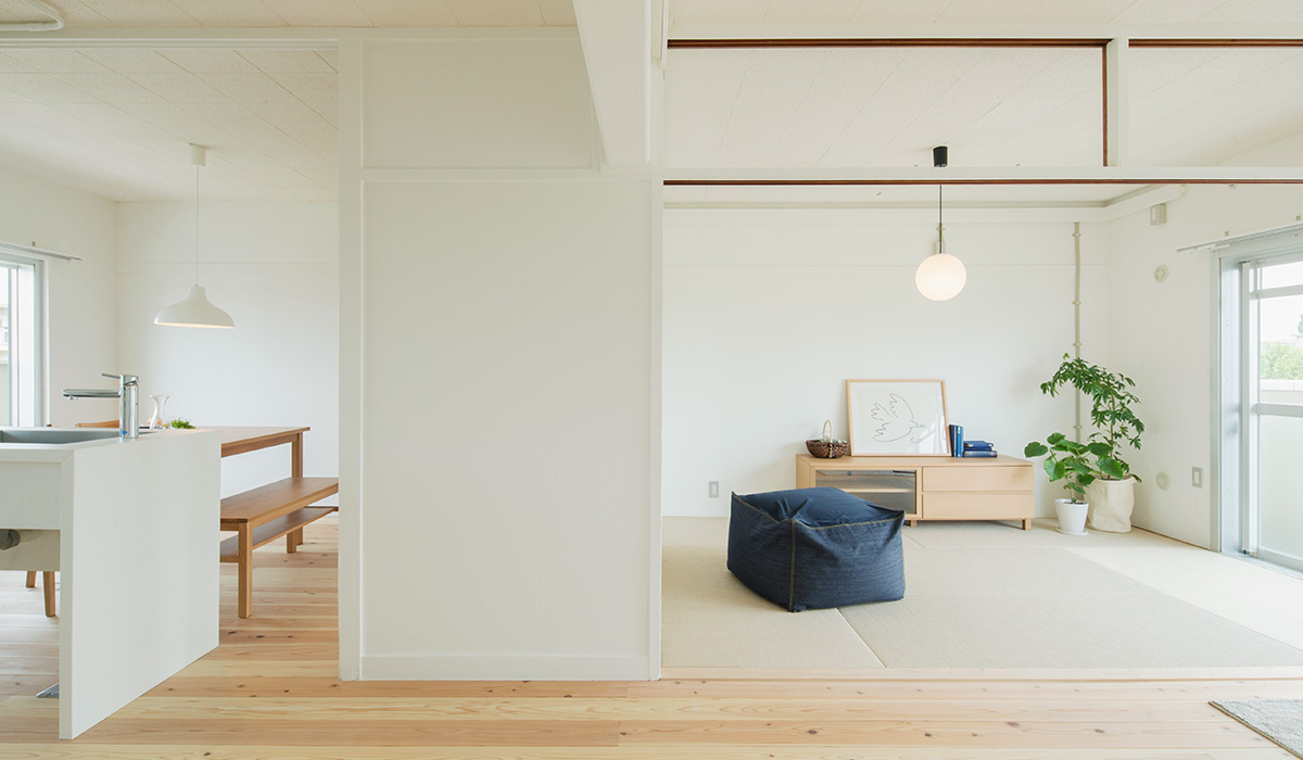 押入の背面壁を撤去することで南北にLDK空間がつながりました。広いリビング空間にはワークスペースを設けました。