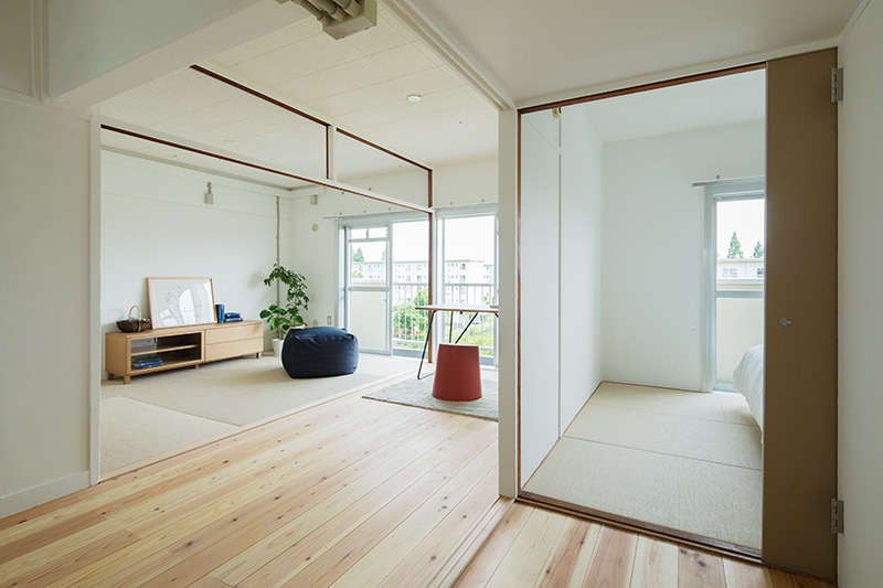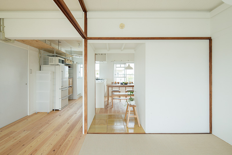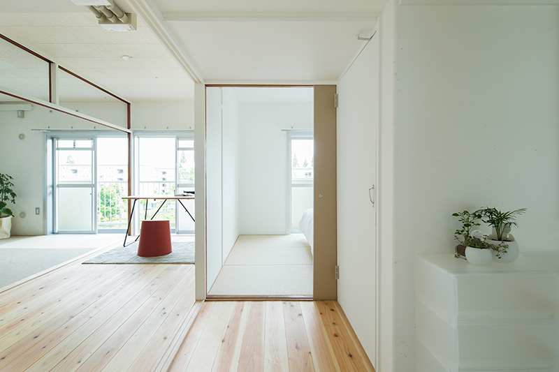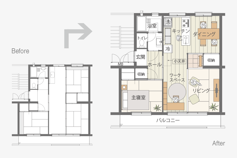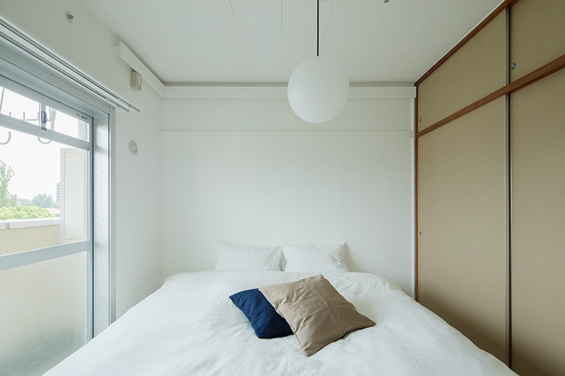 北側の寝室とキッチンをつなげて対面式のダイニングキッチンとすることで、もともとバルコニーのない狭い北側の部屋を有効に活用しました。南側には明るい寝室とリビング+ワークスペースが広がります。