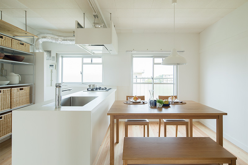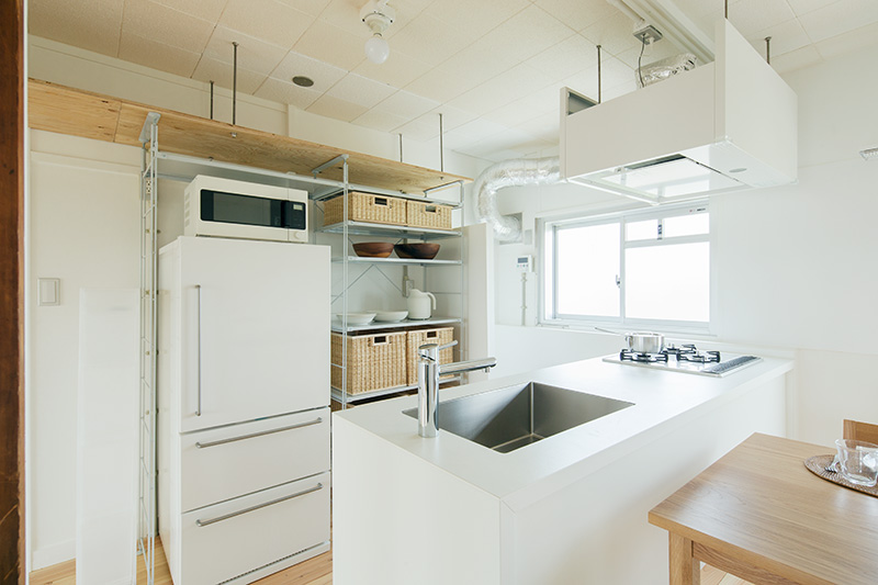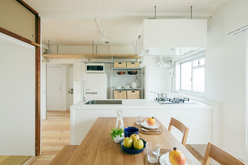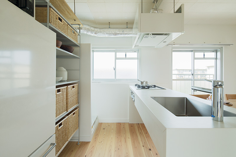 北側の寝室とキッチンをつなげて広いダイニングキッチンとしました。対面キッチンとすることで、部屋全体を見渡すことができます。