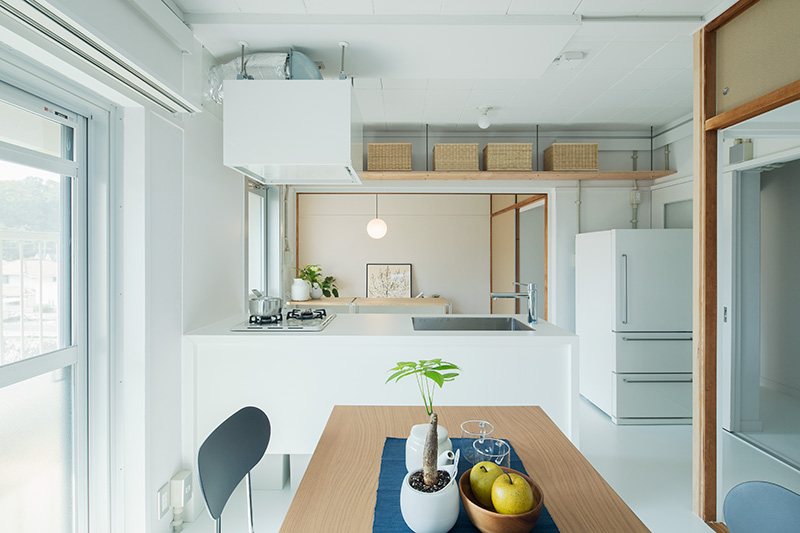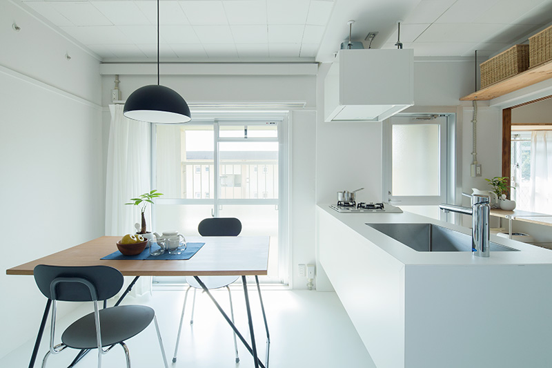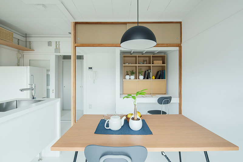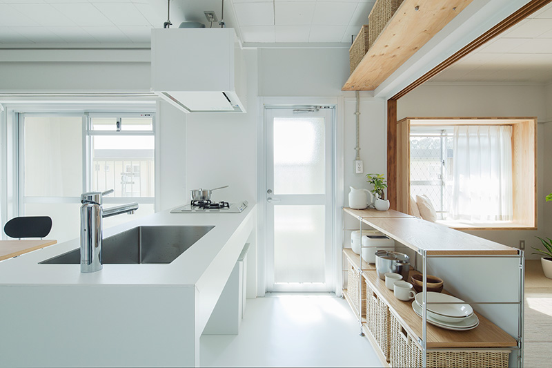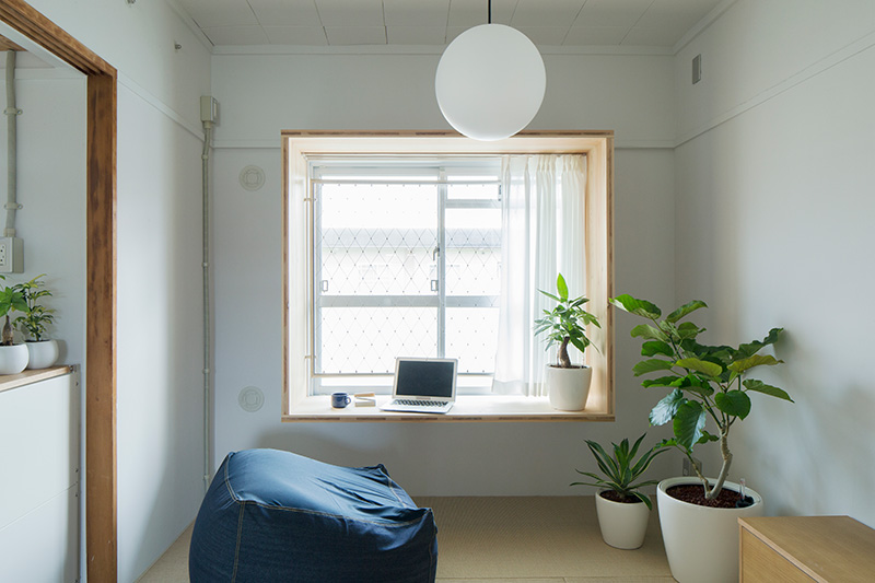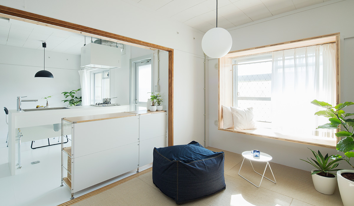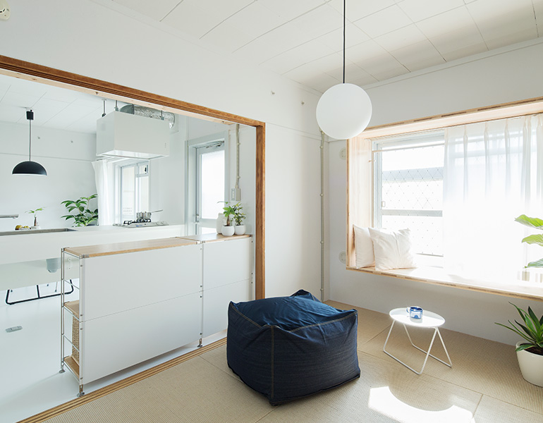 明るいLDKの中心に、対面キッチンを据えました。リビングにもともとあった正方形の窓には、奥行きのある木枠を設置。床に座ってデスクとしても、ベンチとしても活用できます。