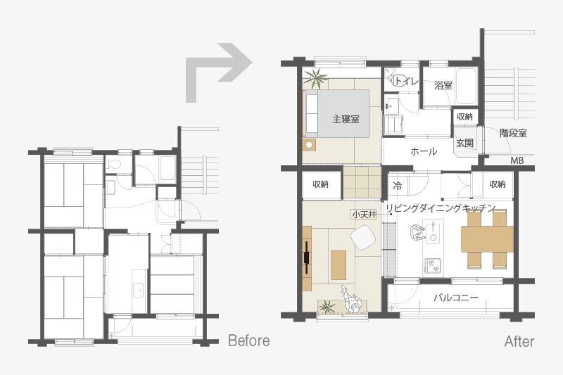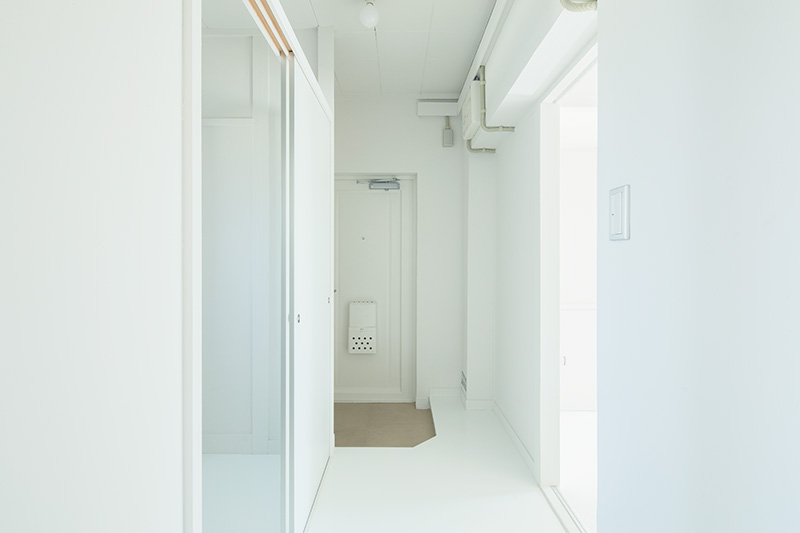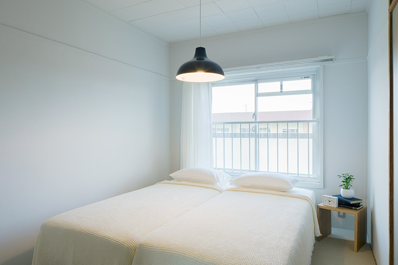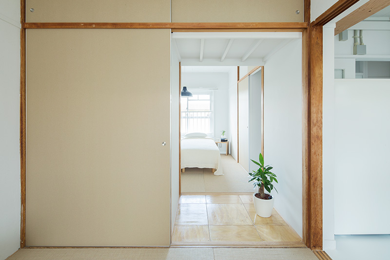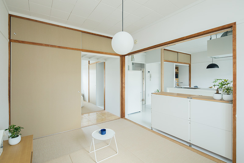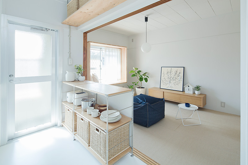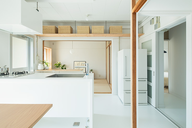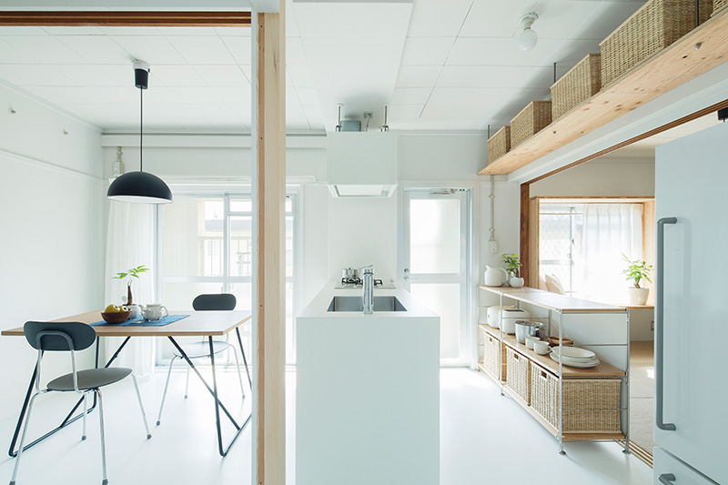 明るいLDKの中心に、対面キッチンを据えました。リビングにもともとあった正方形の窓には、奥行きのある木枠を設置。床に座ってデスクとしても、ベンチとしても活用できます。