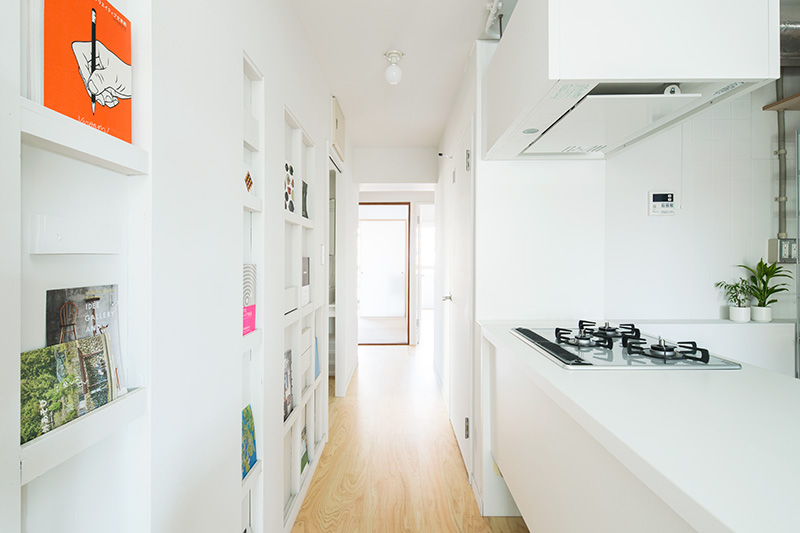長い廊下の壁を利用をしたギャラリースペース。雑誌やポストカードを置いても、お子さまの作品を飾っても。