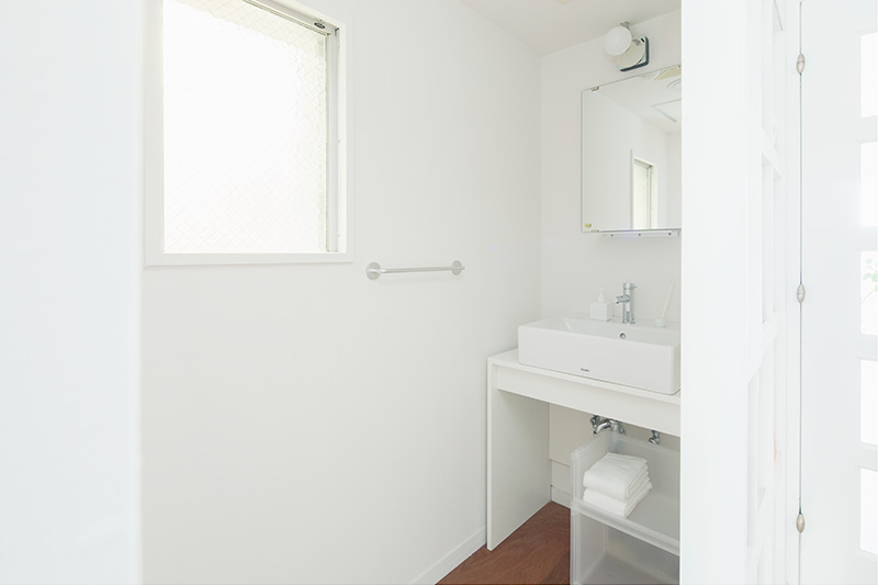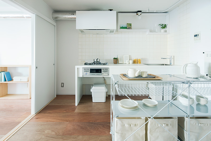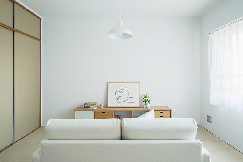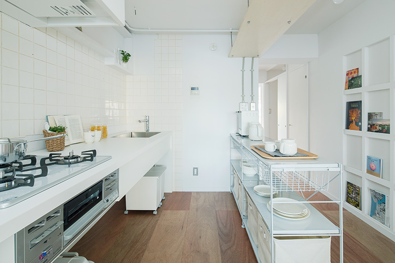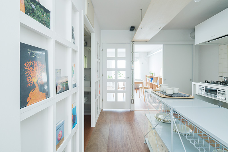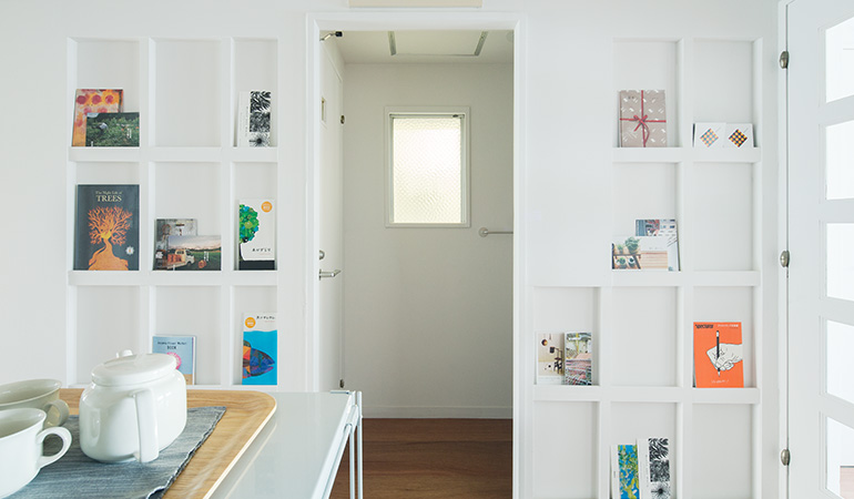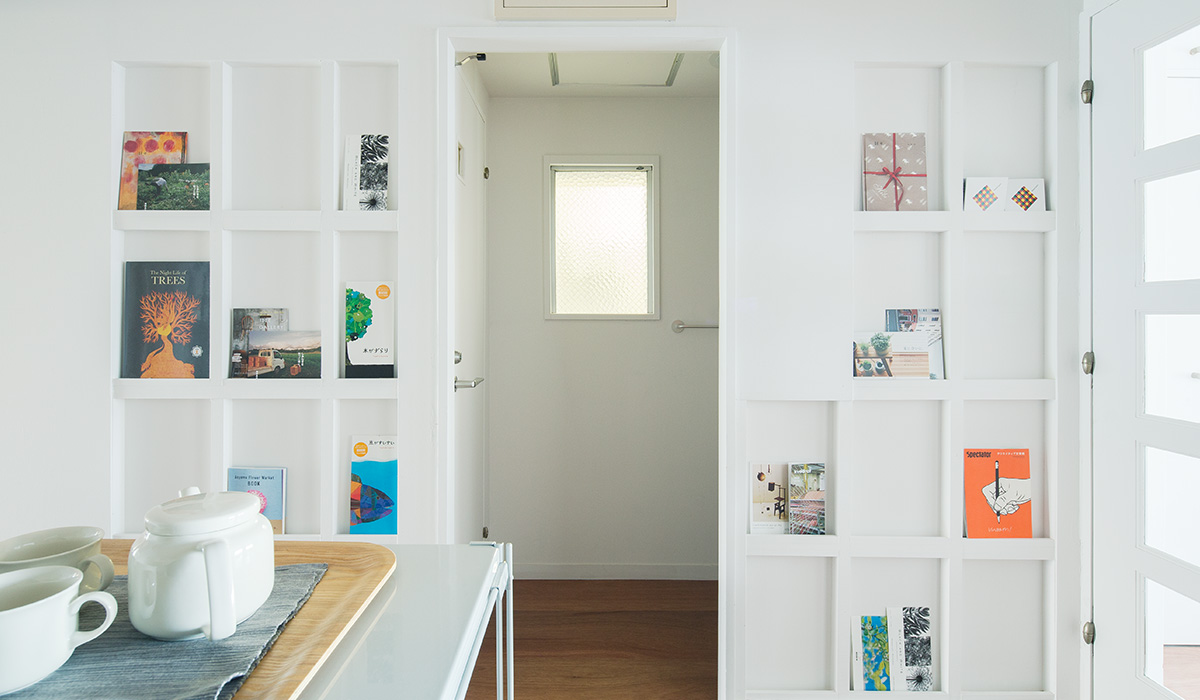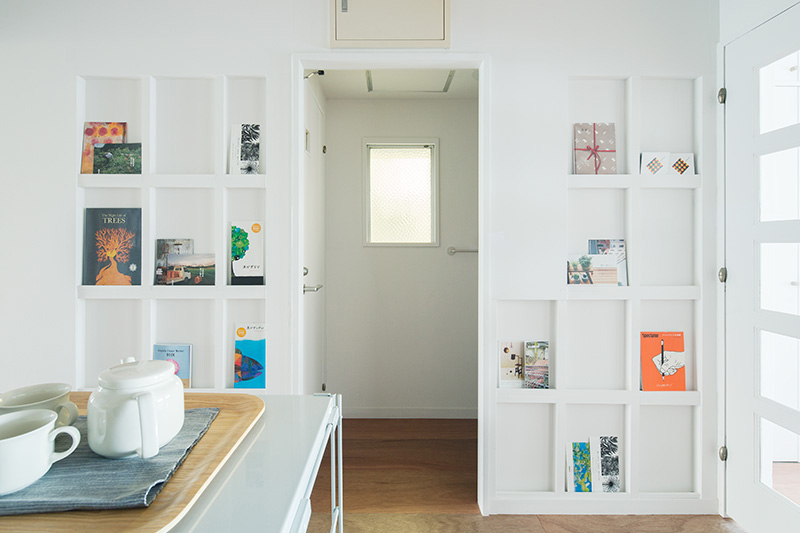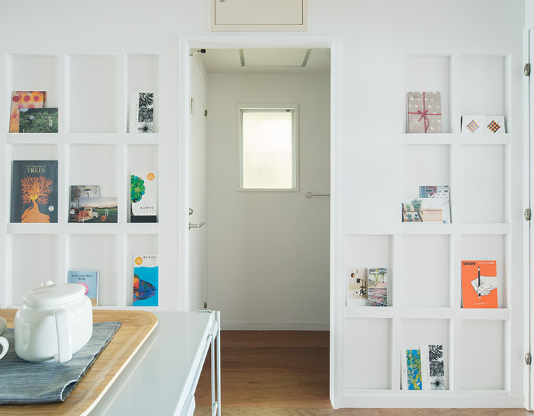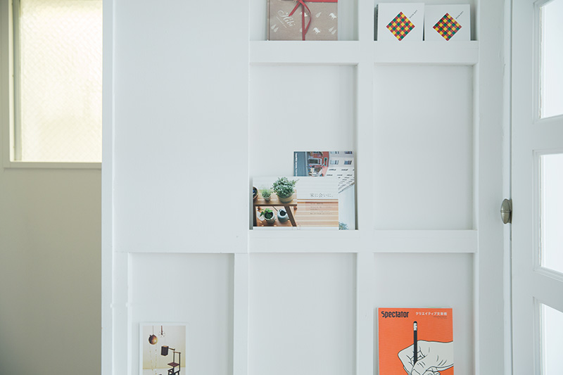 廊下の壁を利用したギャラリースペース。雑誌やポストカードを置いても、お子さまの作品を飾っても。