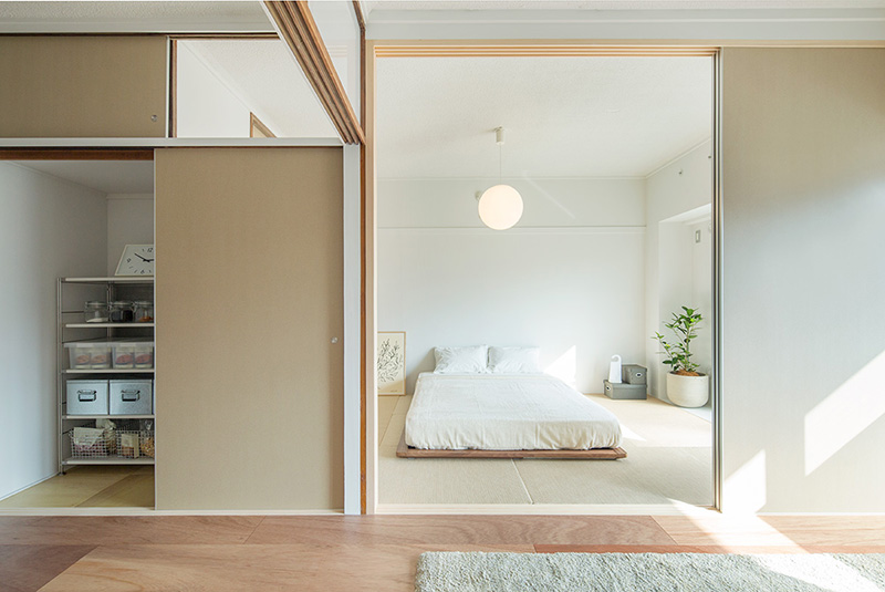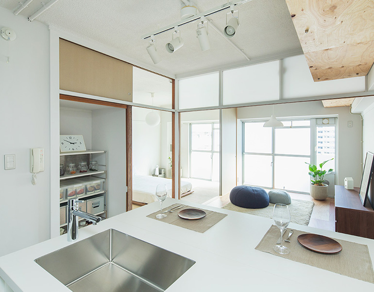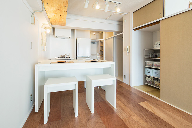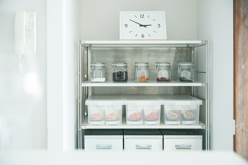 コンパクトなキッチンの横には充実した収納があり、パントリーとして、また調理家電スペースとして使用できます。
