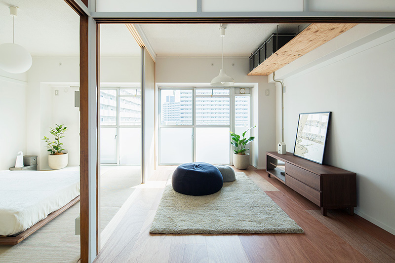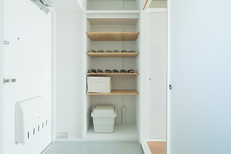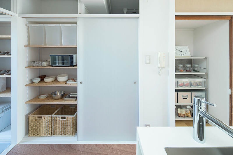 キッチンのすぐ横には、パントリーとして、また調理家電スペースとして使用できる収納があり、玄関土間を広げて土間収納とし、コンパクトライフを実現する充実した収納を随所に配置しました。