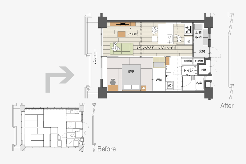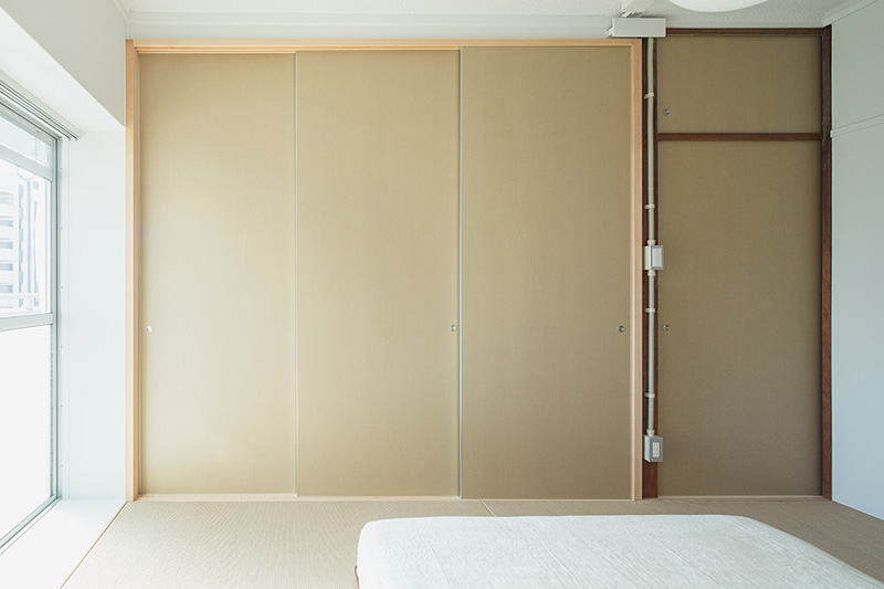 玄関を広げ、窓のある明るい土間収納スペースとしました。もともとはキッチン壁であったタイル壁が、アクセントになっています。
