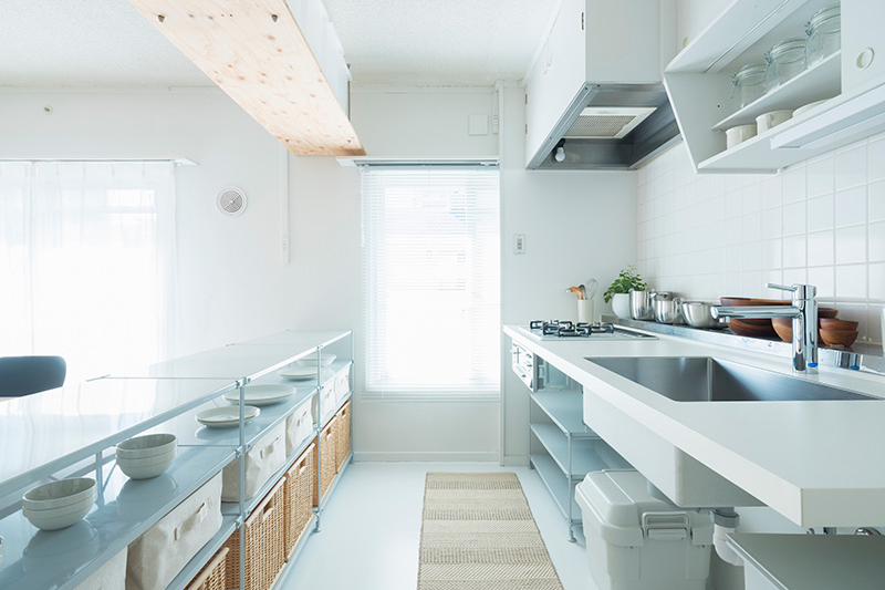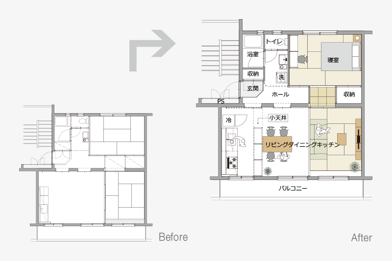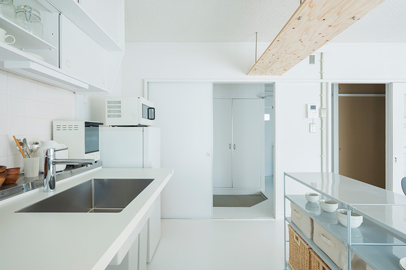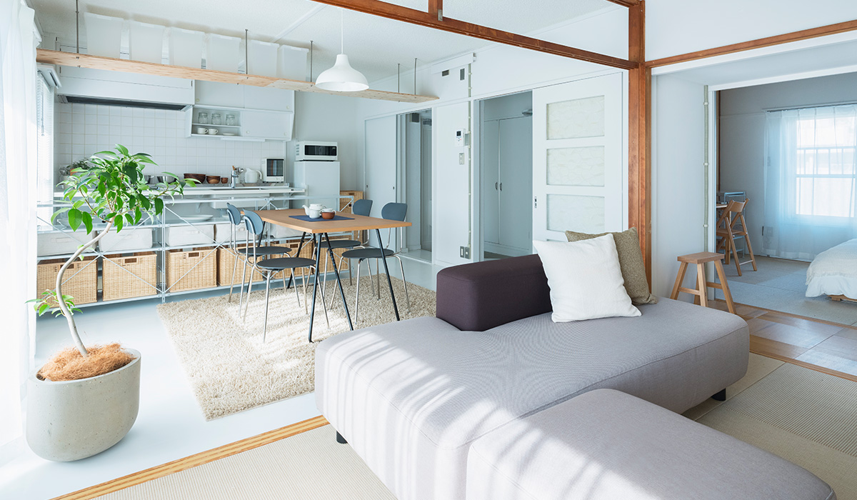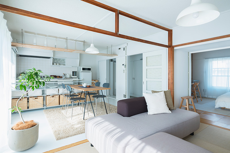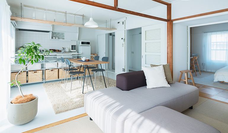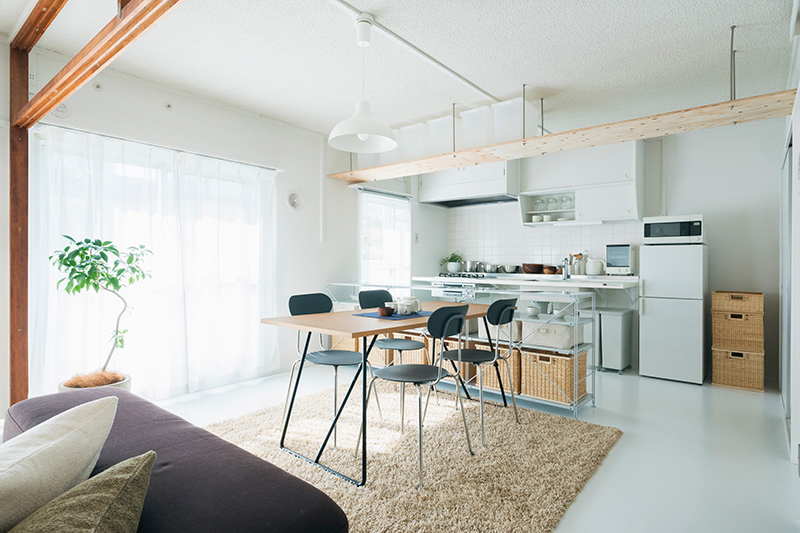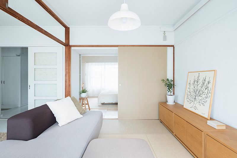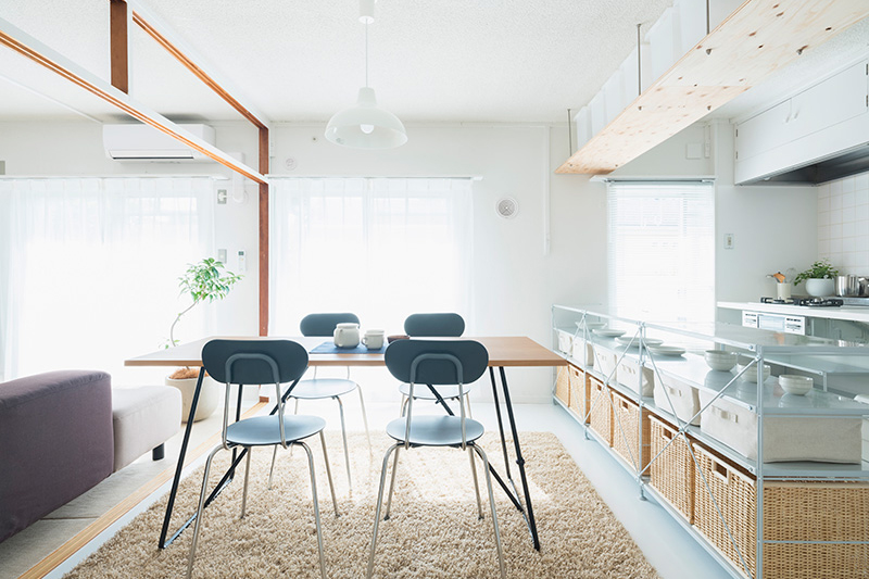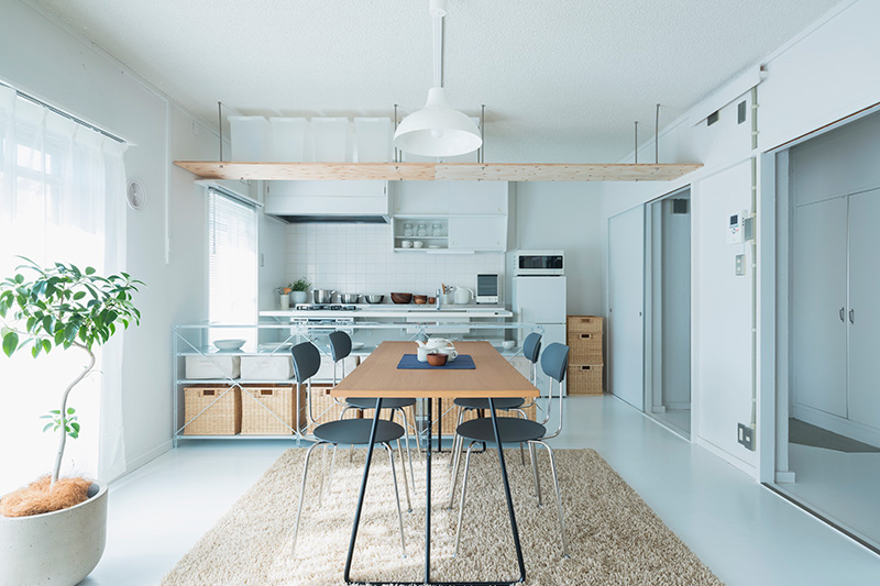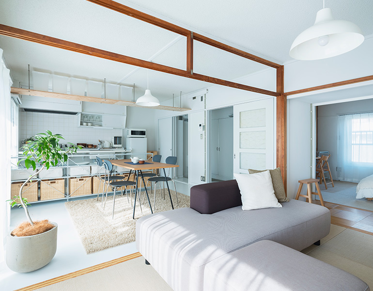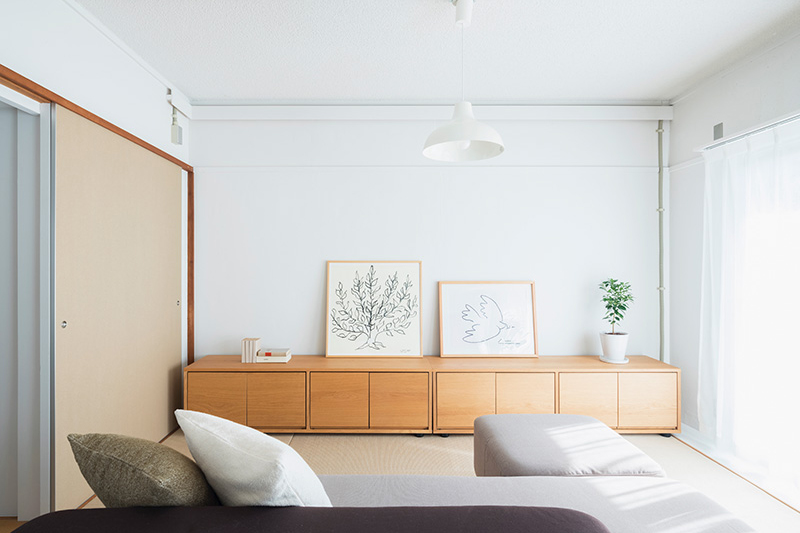 小天井と鴨居を残しながら、既存のふすまを撤去することで、リビング、ダイニング、キッチンをゆるやかにつなげました。一室空間でありながらも、それぞれのエリアを感じることができます。