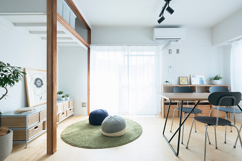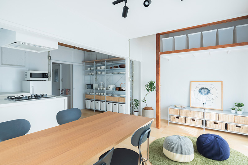 押入の柱を残し、ふすまと壁を撤去して床材を敷き込むことで一体感のあるLDKとしました。