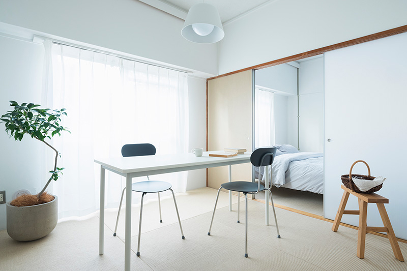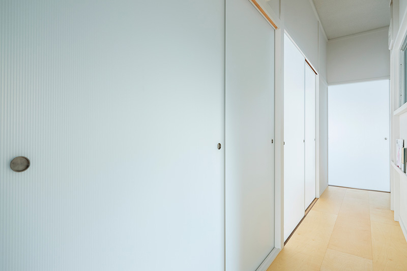 長い廊下の壁を利用したギャラリーとつながるアトリエを設けました。ふすまを開け放つとギャラリー、アトリエ、寝室が一体の空間となり、閉めると、2寝室のファミリータイプの間取りに変化します。
