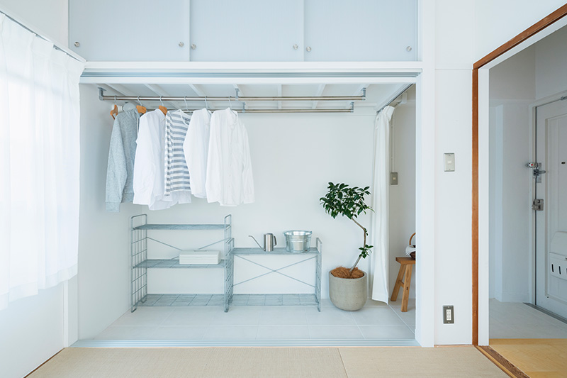 長い廊下の壁を利用したギャラリーとつながるアトリエ空間を設置しました。ふすまを閉めることで2寝室のファミリータイプの間取りに変化します。