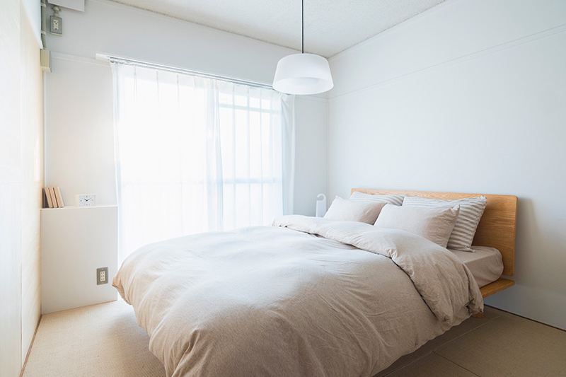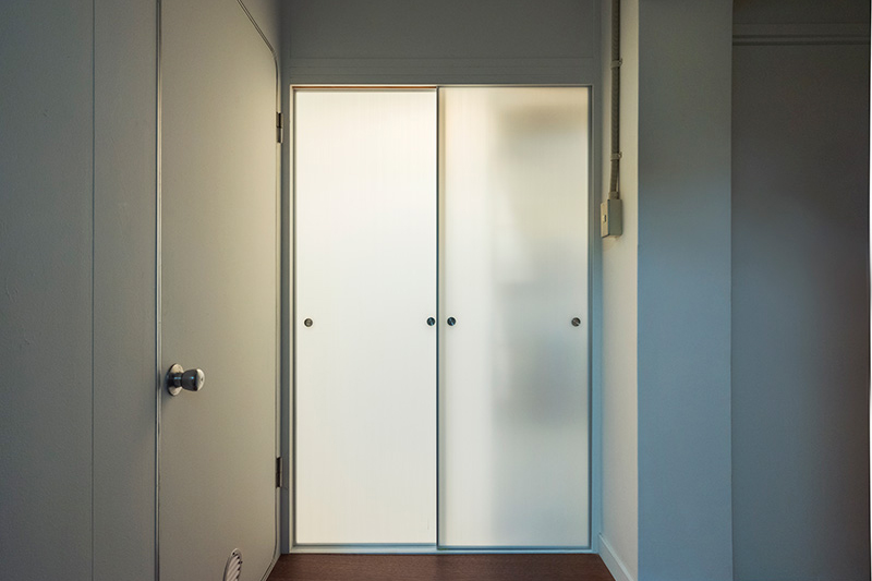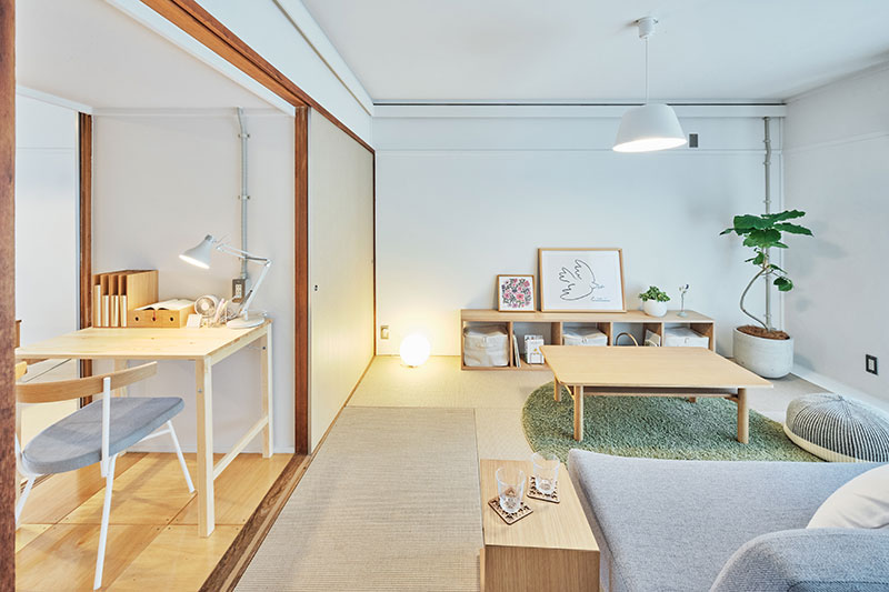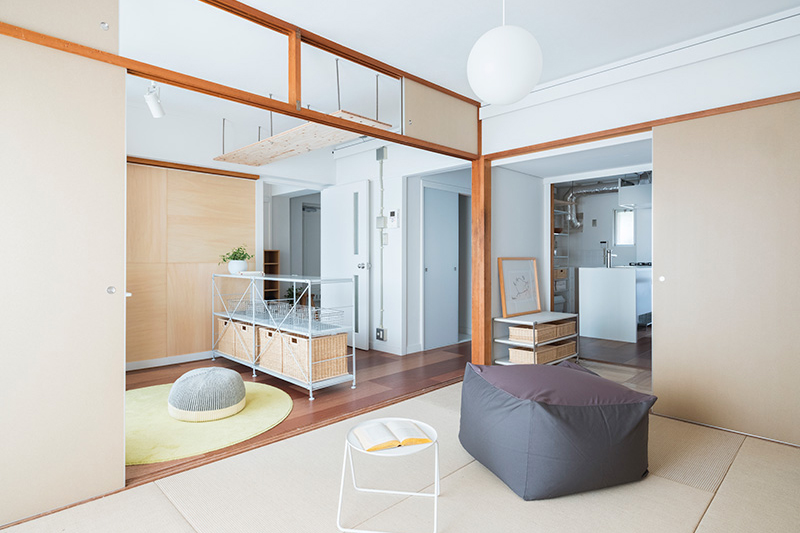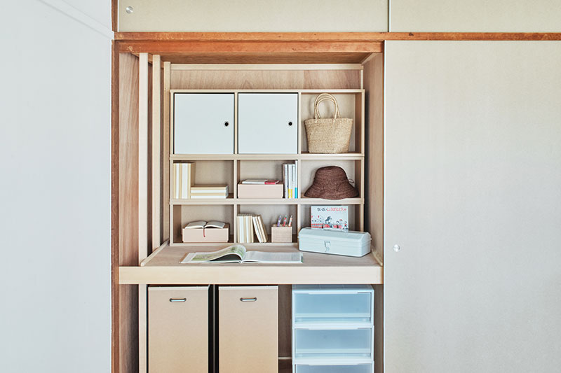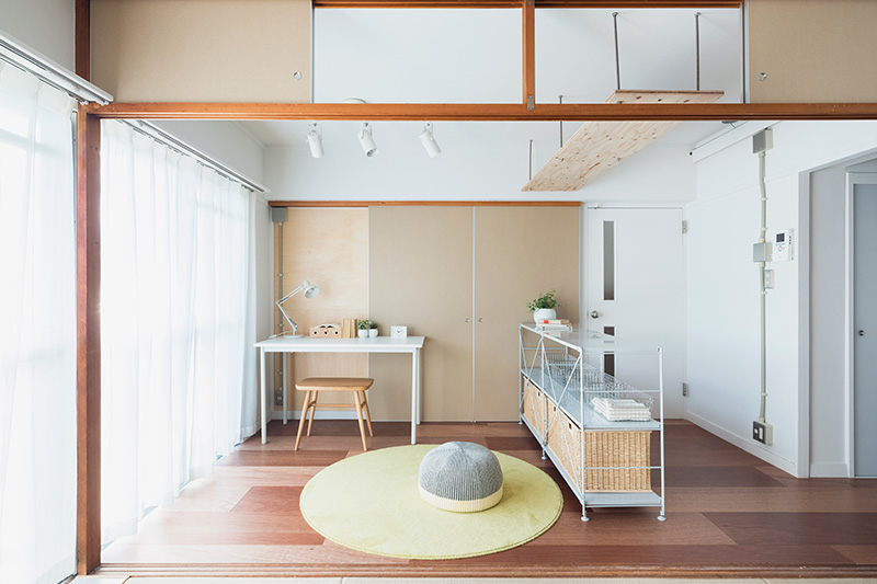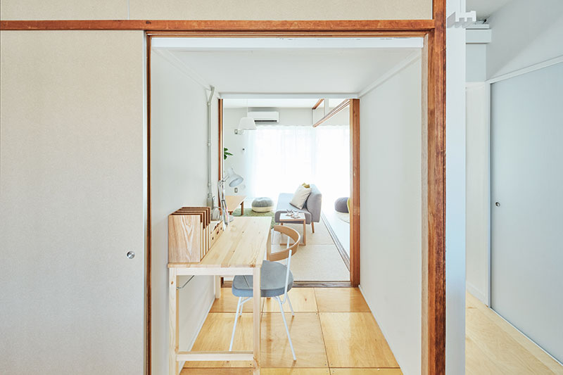 間取りの中央に位置する押入の一部を撤去し、南北に風を通すトンネルとしました。ふすまを開け閉めすることでワークスペースとしても利用できます。