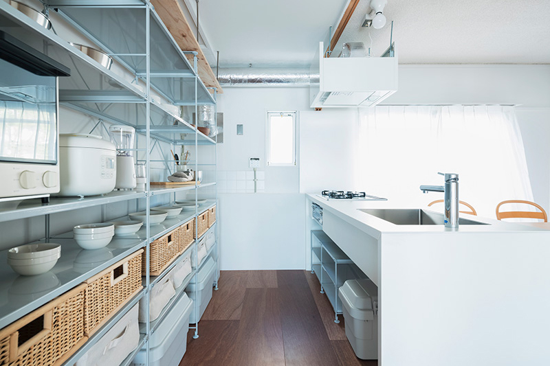 もともと、廊下とキッチン両方から使用できる収納を利用して通り抜けれるパントリー兼、クローゼットとしました。通り抜けれることで、家事動線がスムーズになっています。