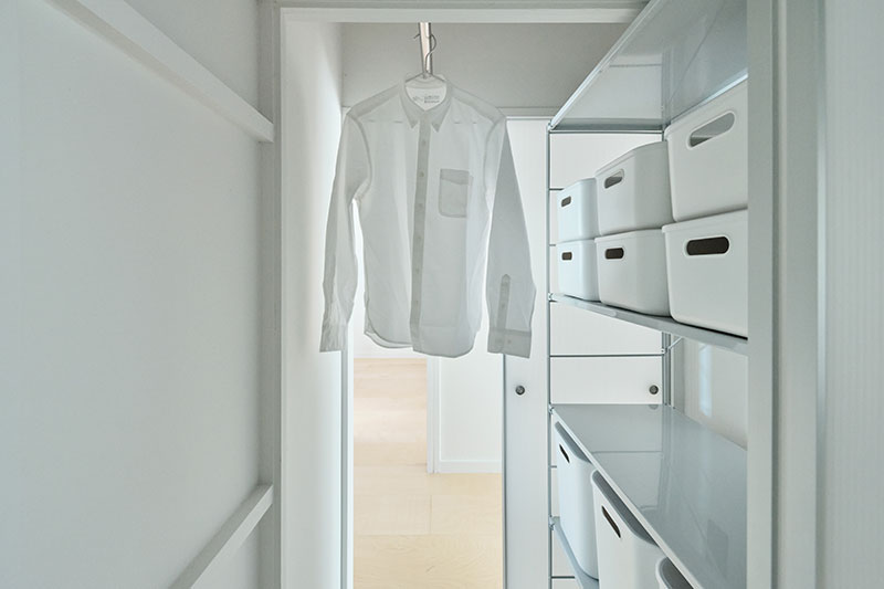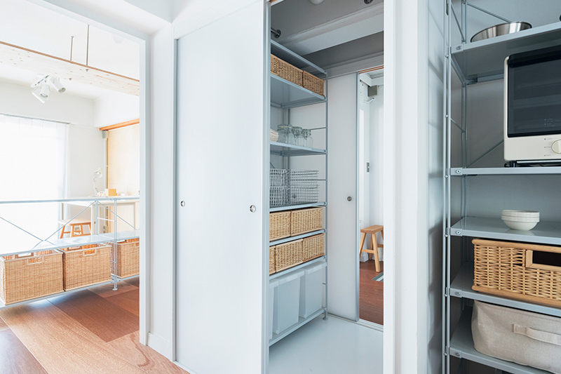 もともとは大型家具の搬入口だった収納を利用して、パントリーにもクローゼットにもなる空間を設けました。主にキッチン側からはパントリーとして、玄関側からはクローゼットとして使用できます。