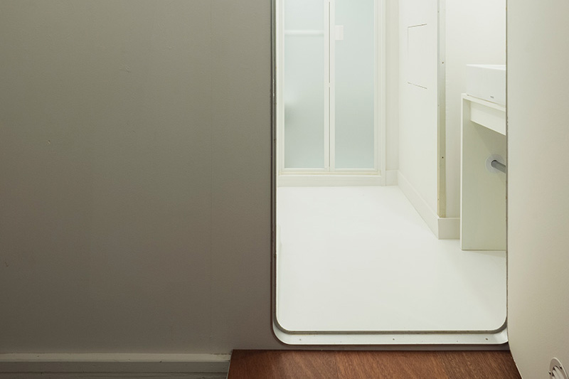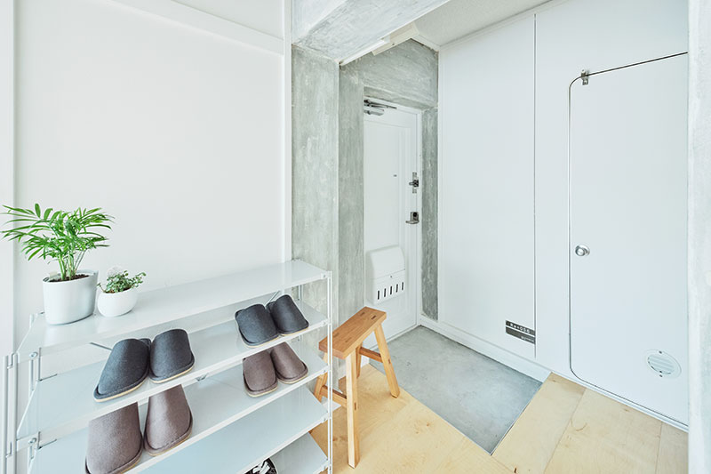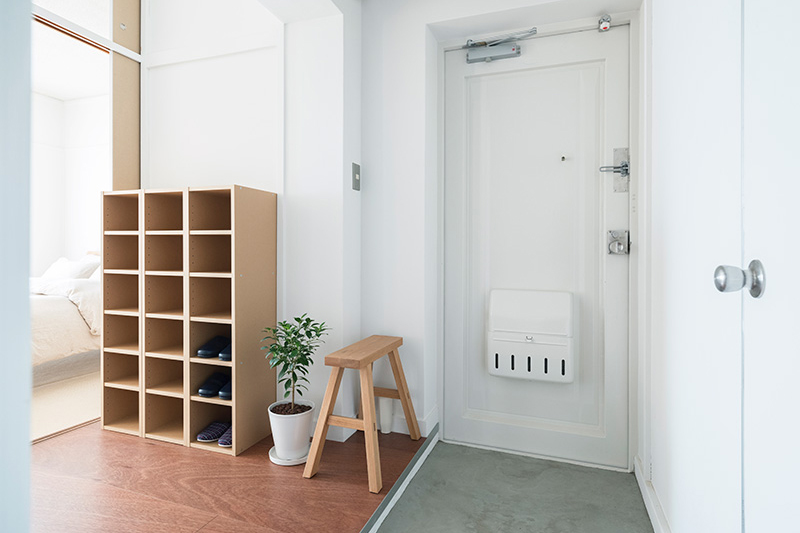 キッチン側から見た、パントリーにもクローゼットにもなる小部屋。機能的でありながら、キッチン(内)と玄関(外)をつなぐトンネルのような場所です。