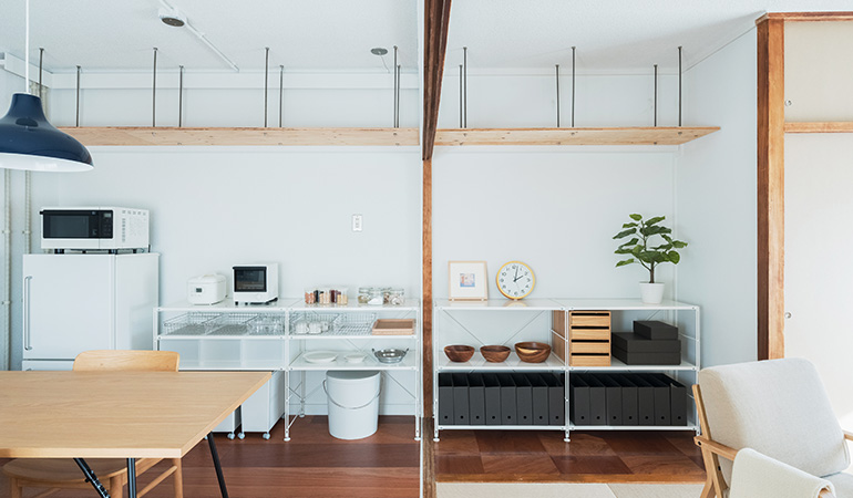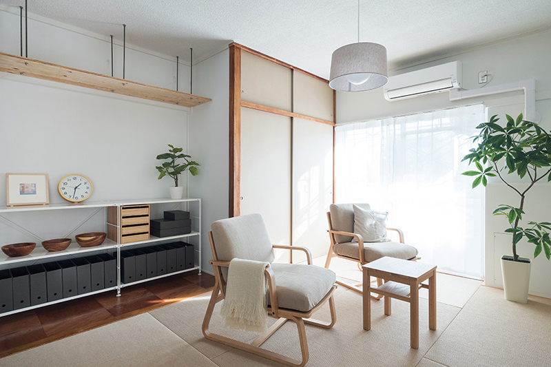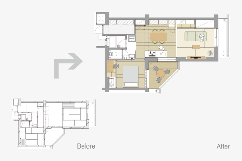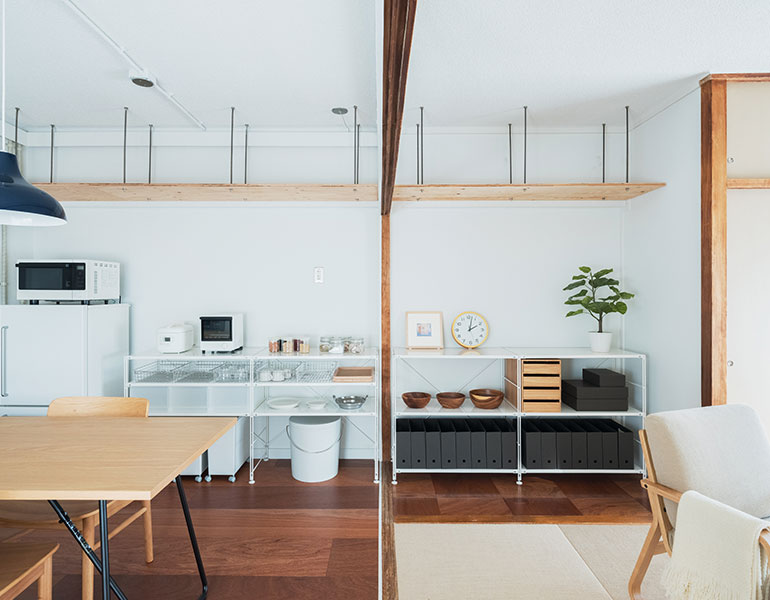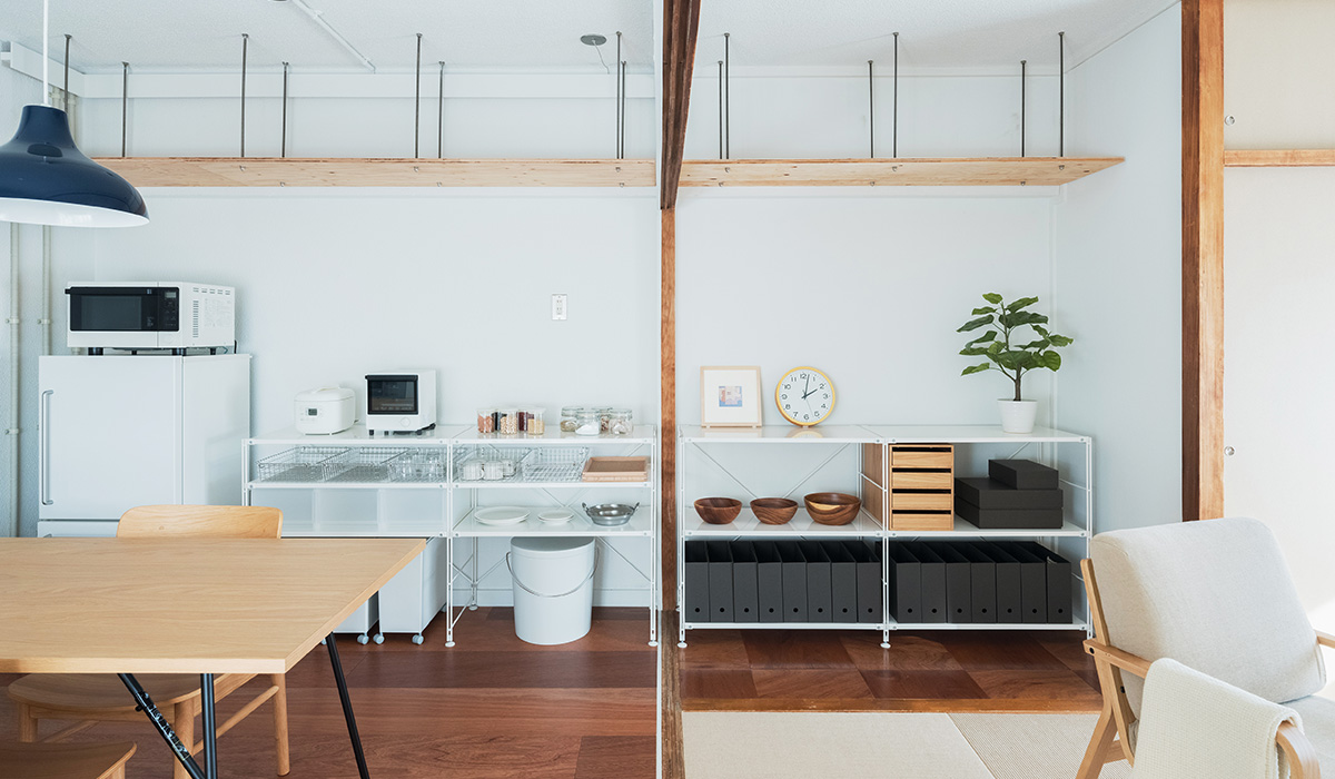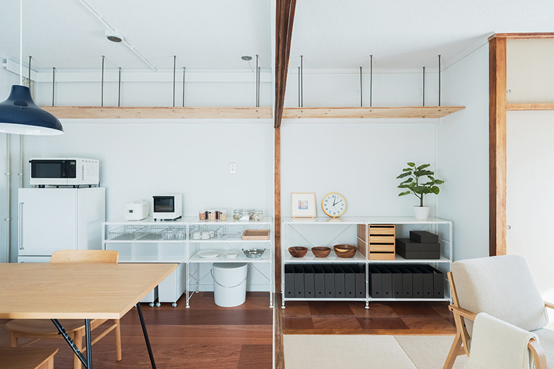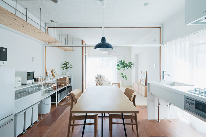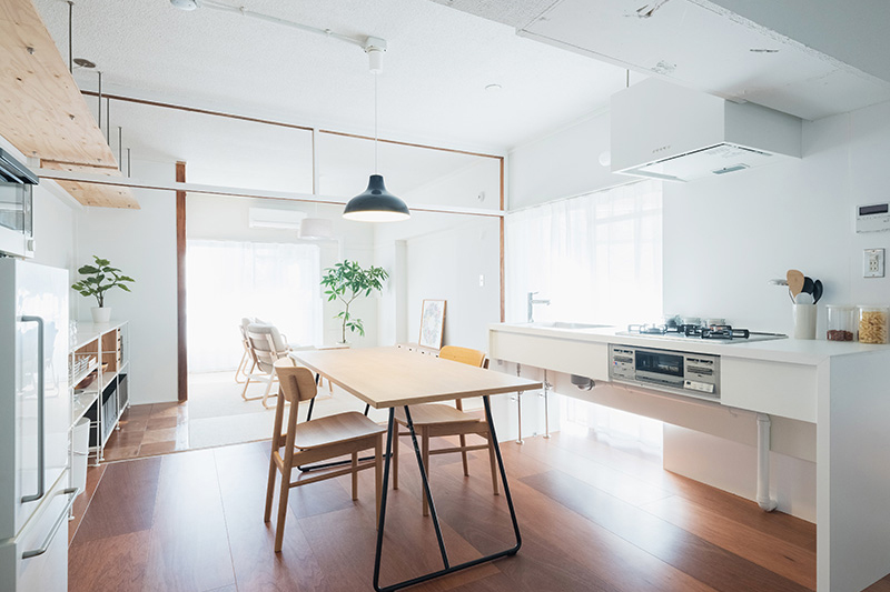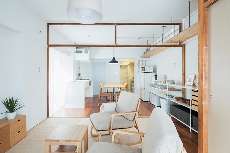 ふすまを撤去したことでダイニングとリビングは広く一体に繋がりました。また屋外ともウッドデッキで繋がります。