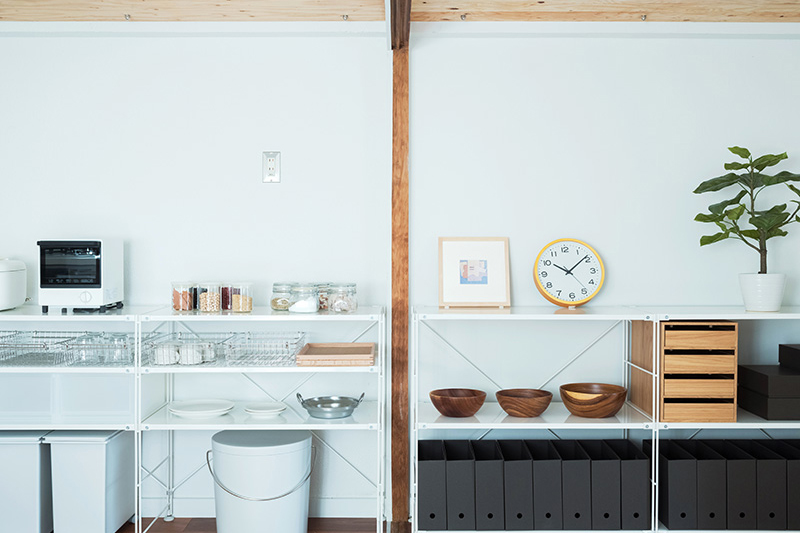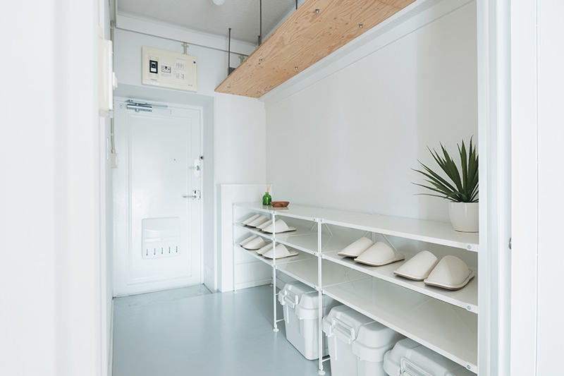 玄関土間を廊下まで広げることで、大量の靴はもちろん、アウトドア用品なども収納できる土間収納空間としました。