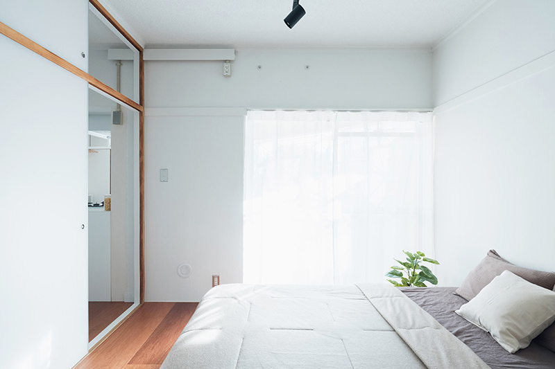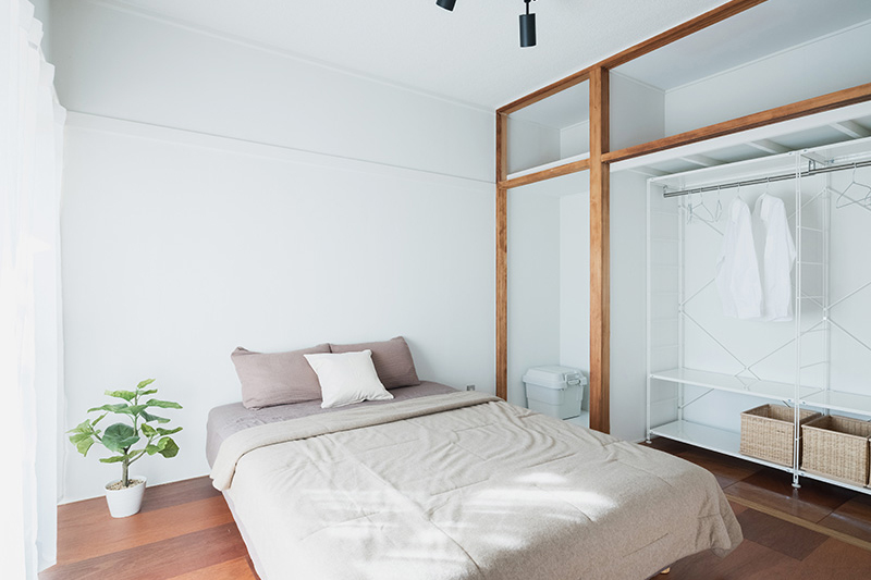 広いバルコニーにウッドデッキを全面に設置し、ウッドデッキを中心に、LDKと寝室を屋外空間と繋げました。天気の良い日にはテーブルと椅子を持ち出して、屋外で食事や、テレワークをすることができます。また、窓向きにキッチンを設置することでバルコニー側からシンクを使うことができるようにしました。LDKからも、寝室からもアクセスができるので積極的に屋外空間を楽しんでみては如何でしょうか。