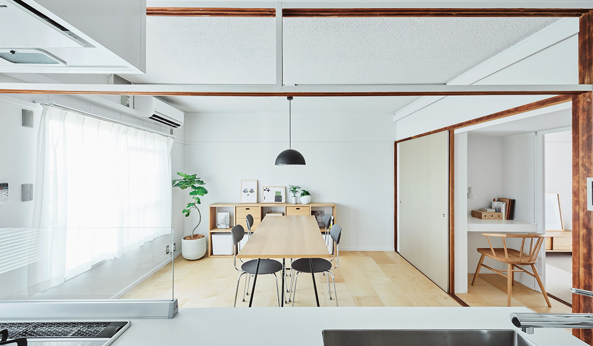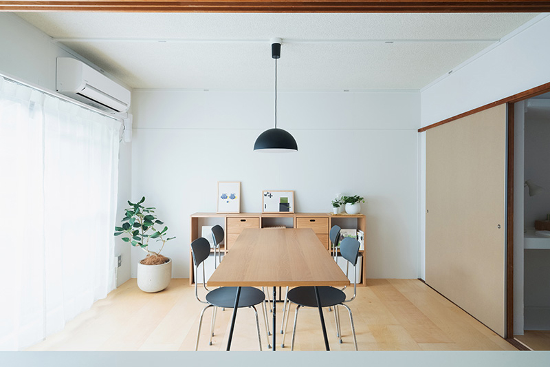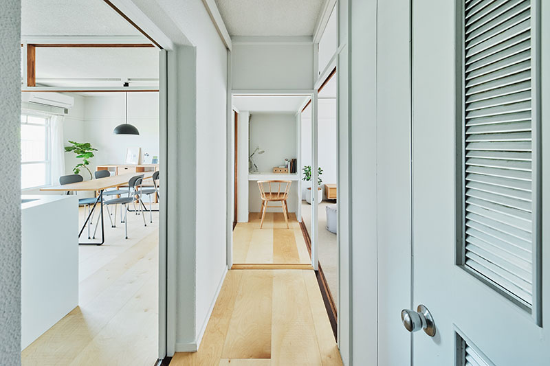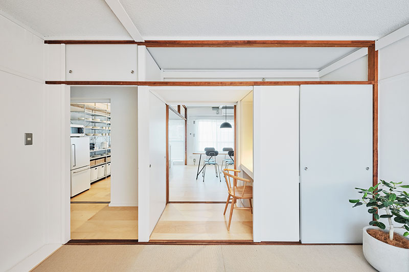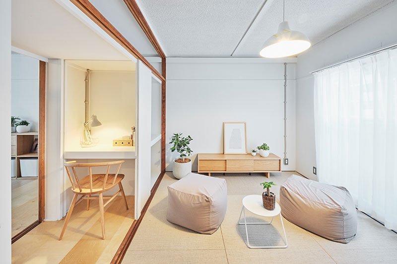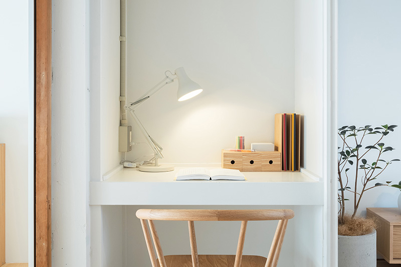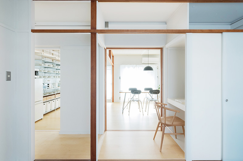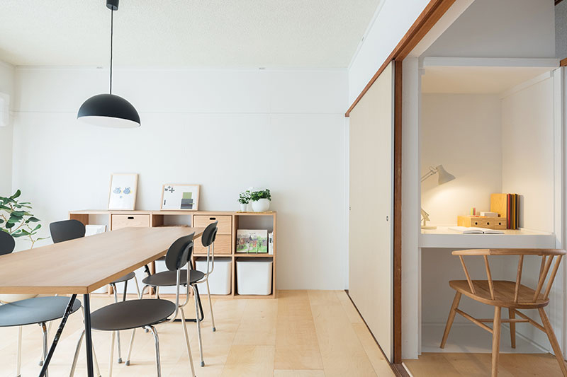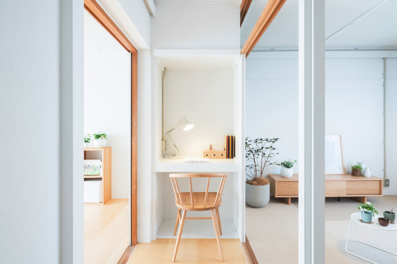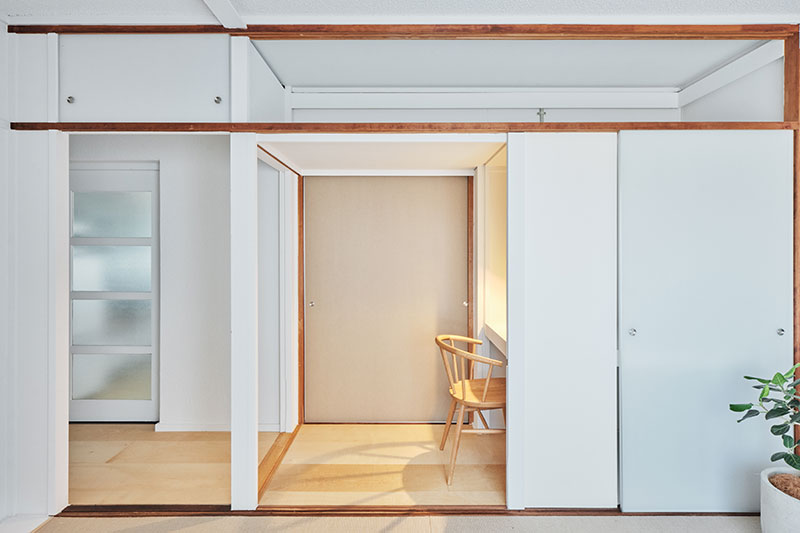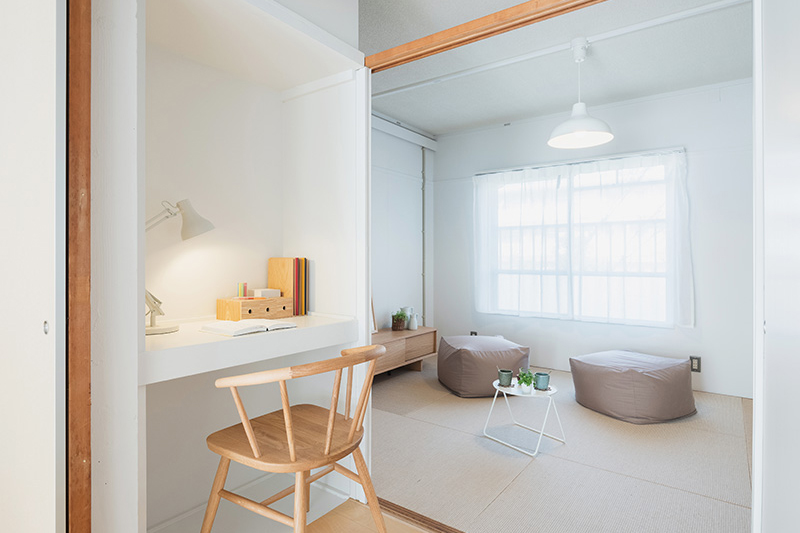 南北を分断していた押入の一部を撤去し、風通しをよくすると共に押入の中棚を利用したワークスペースを設置しました。廊下側とはFIXの半透明ふすまで仕切られており、取り外すと廊下と一体となり、ふすまを閉じると半個室の落ち着いたワークスペースにもなります。
