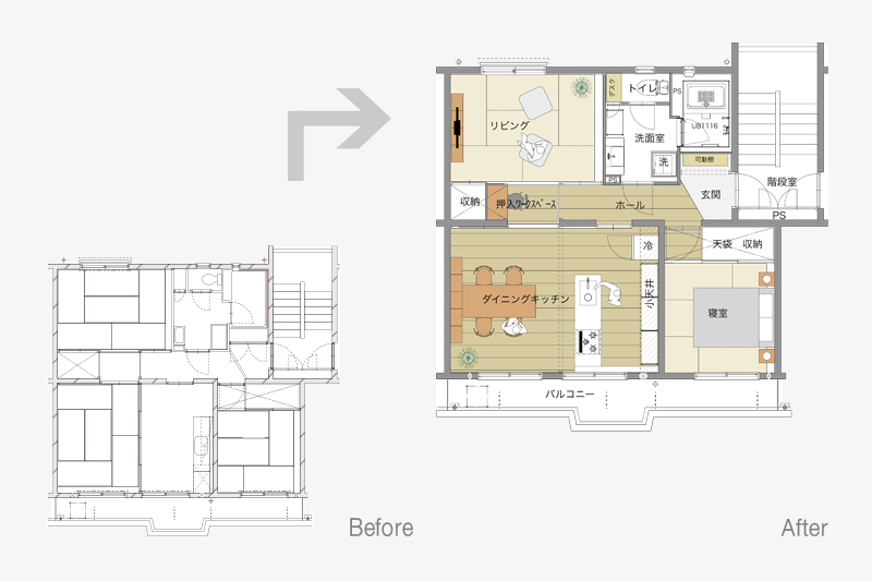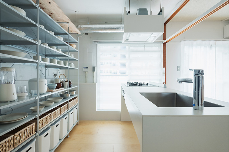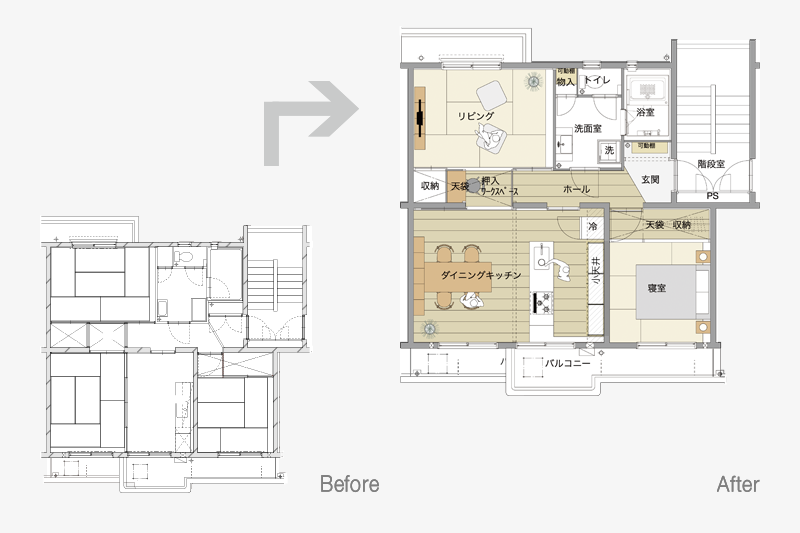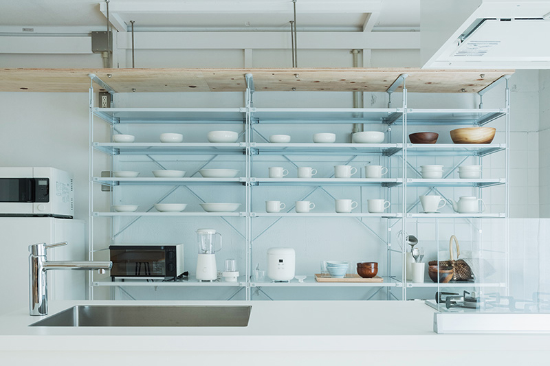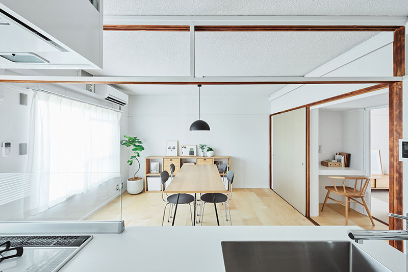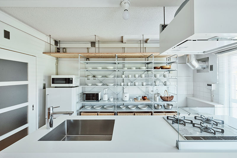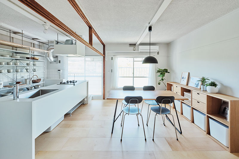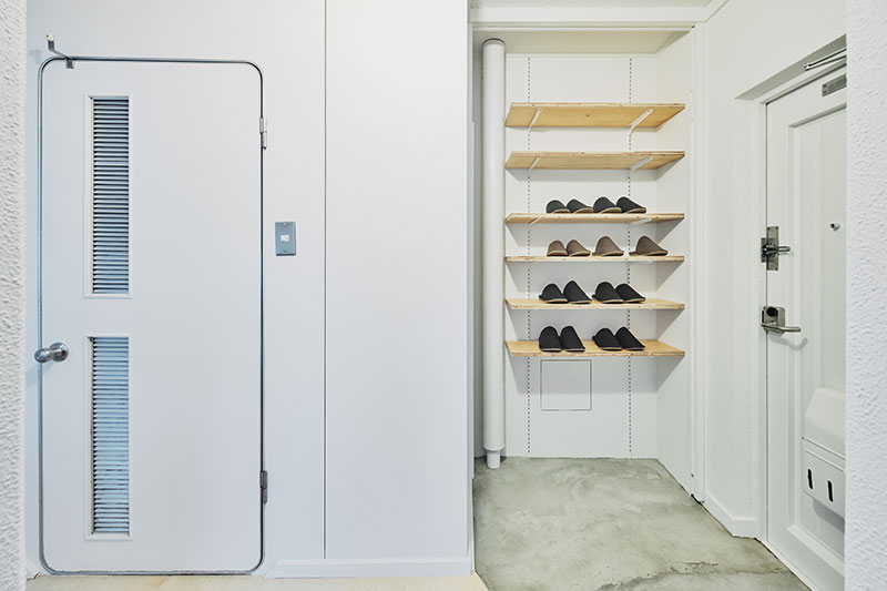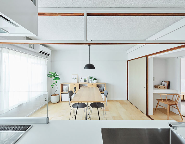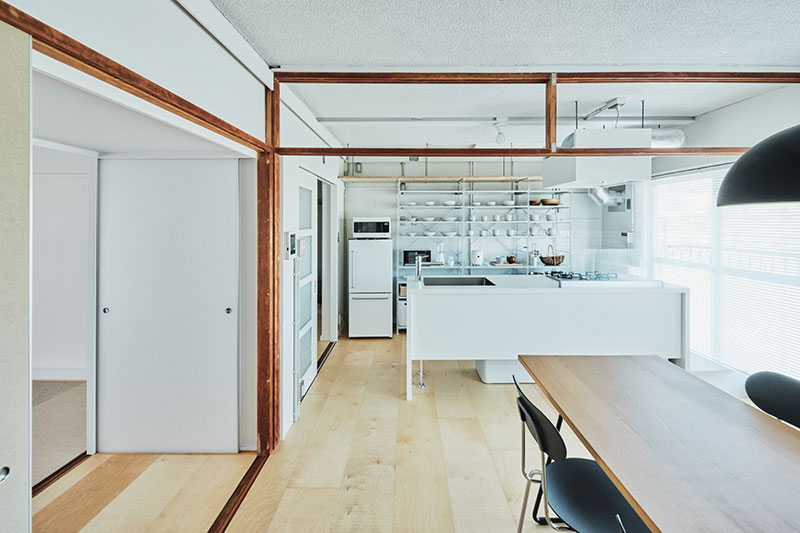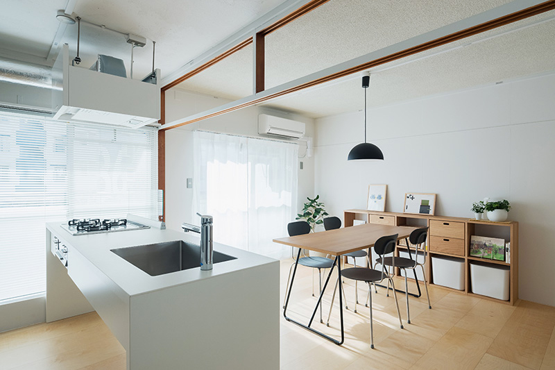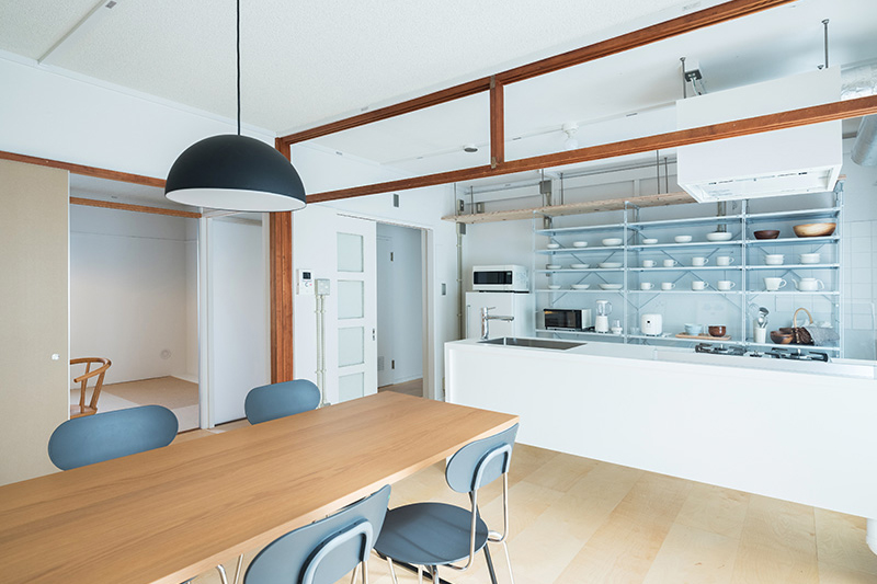 南北を分断していた押入の一部を撤去し、風通しをよくすると共に押入の中棚を利用したワークスペースを設置しました。廊下側とはFIXの半透明ふすまで仕切られており、取り外すと廊下と一体となり、ふすまを閉じると半個室の落ち着いたワークスペースにもなります。