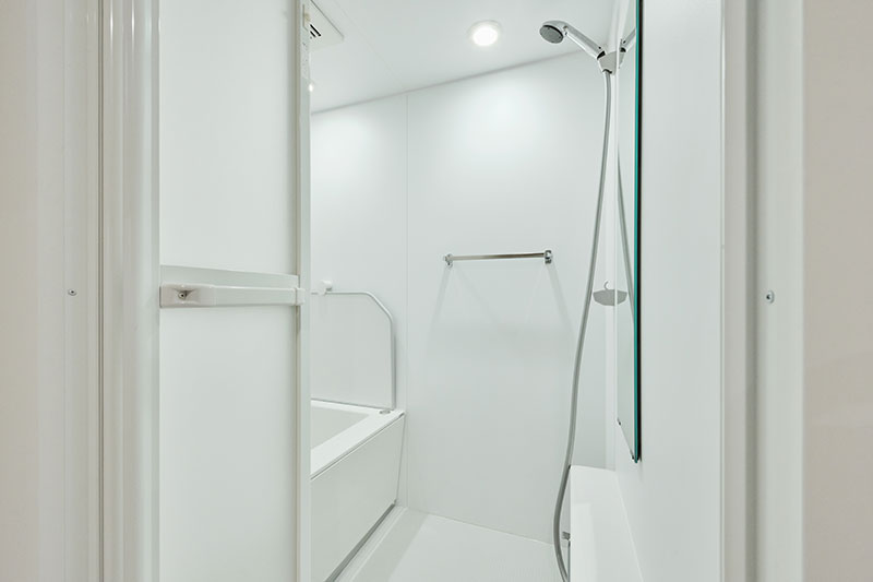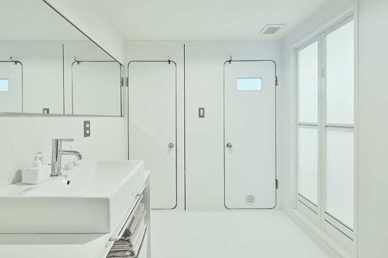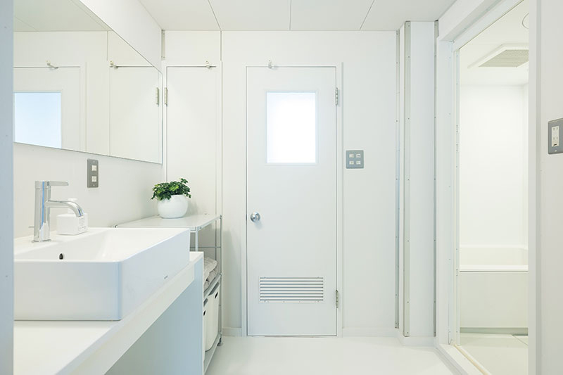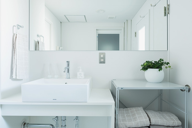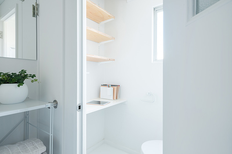 洗面室にはワイドなミラーがあり狭い空間でも広く感じられます。トイレにもデスクがありどこにいても仕事ができます。