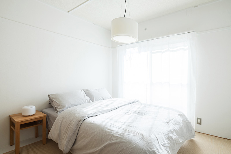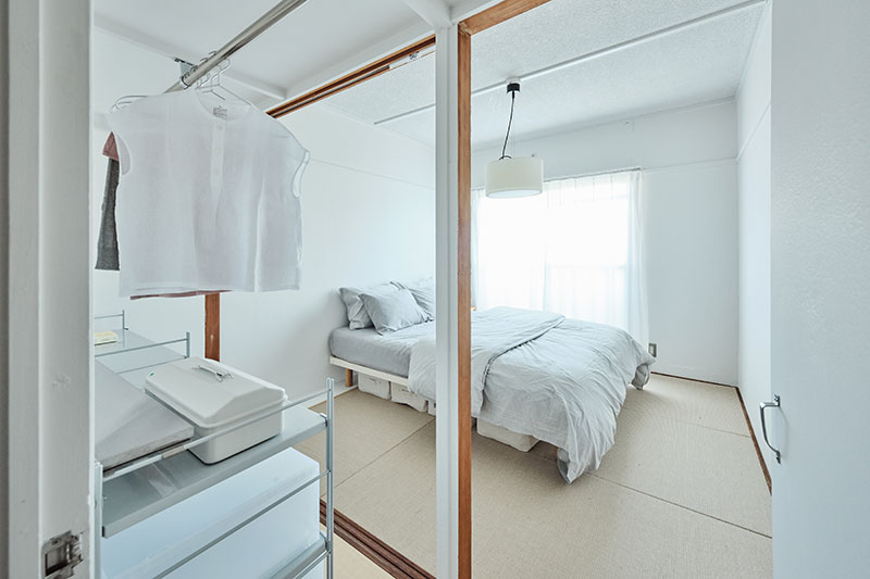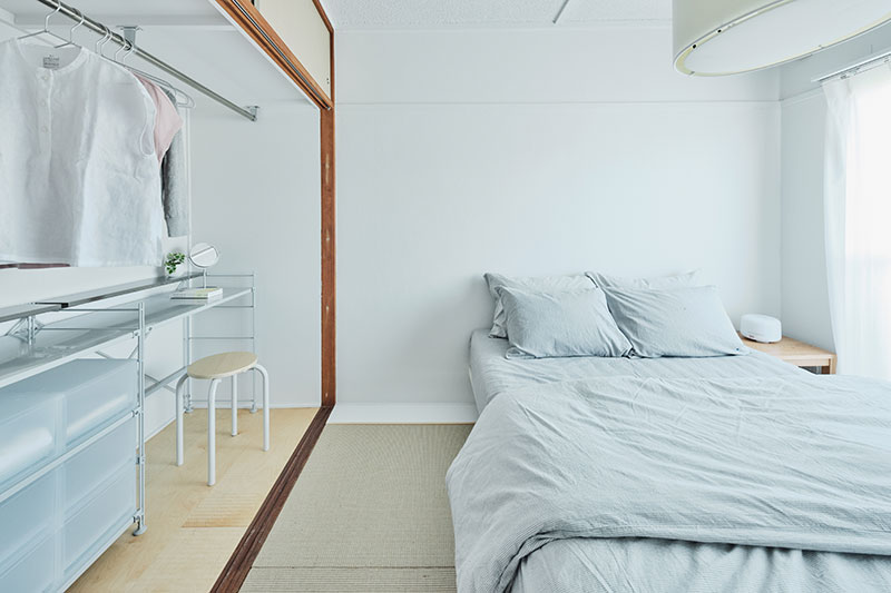 寝室の押入の一部を撤去することで空間をつなげ、4.5畳の部屋を6畳の広さに拡張させました。鴨居の溝にカーテンレールを設置しているので、クローゼットとしても活用できます。
