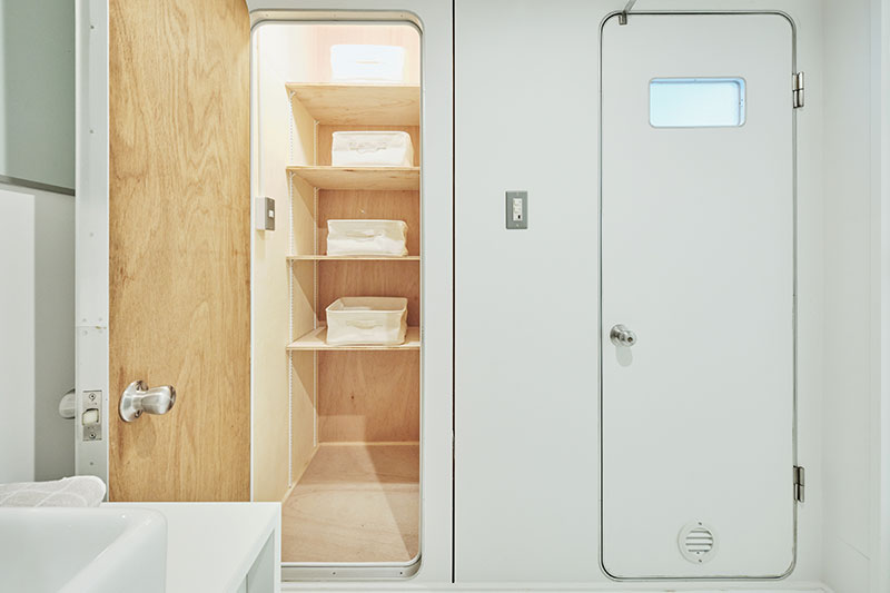 洗面室内の建具をそのまま利用。角の丸まった扉と握り玉は水まわりのかわいらしいアクセントに。薄暗かった収納内に照明を追加することで作業性を向上させました。