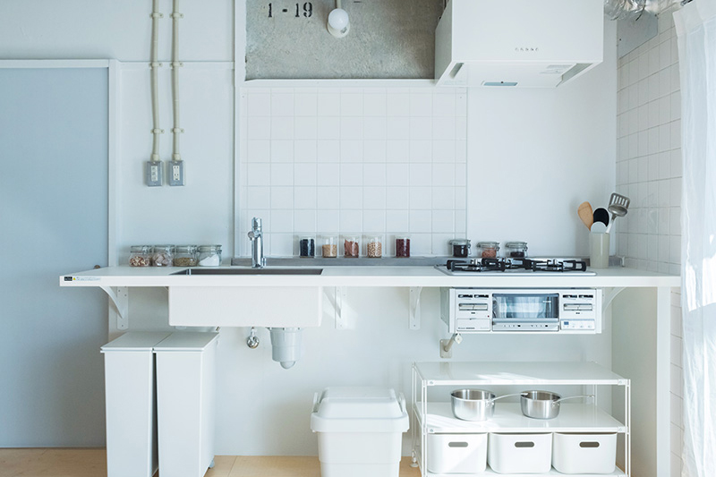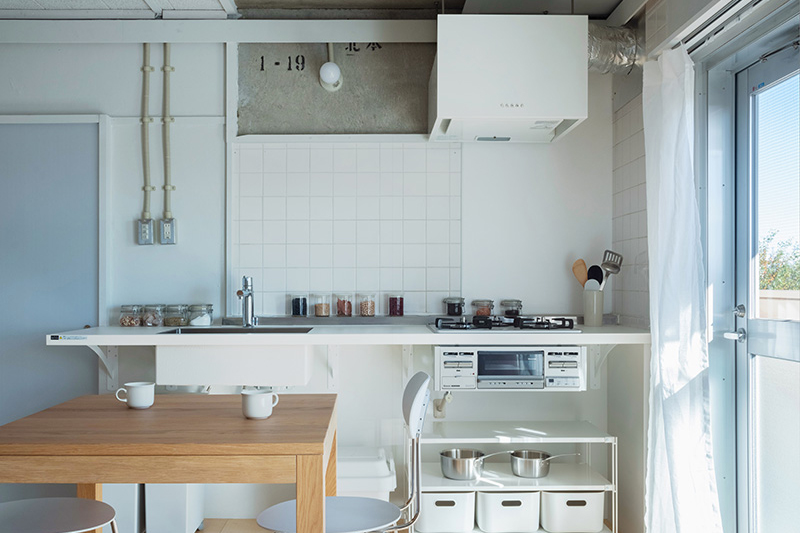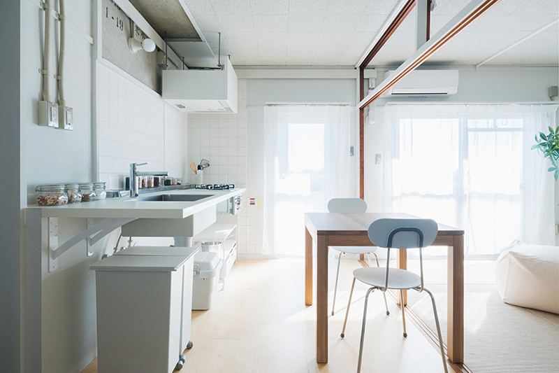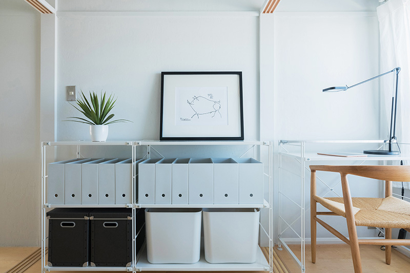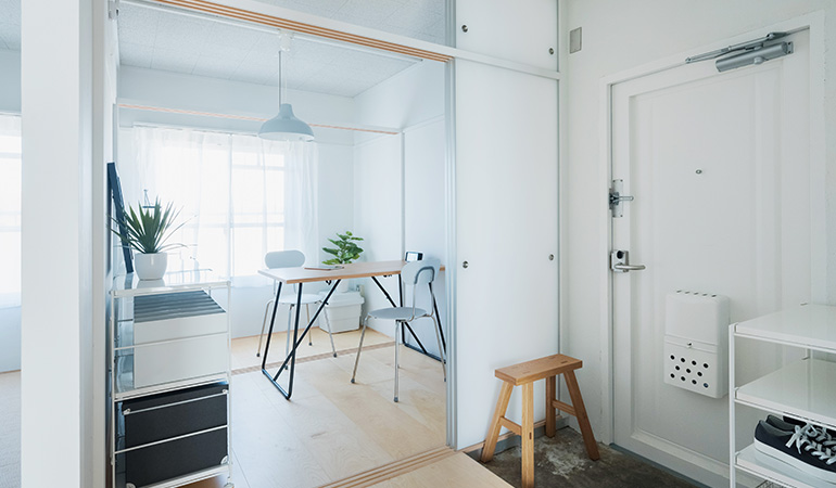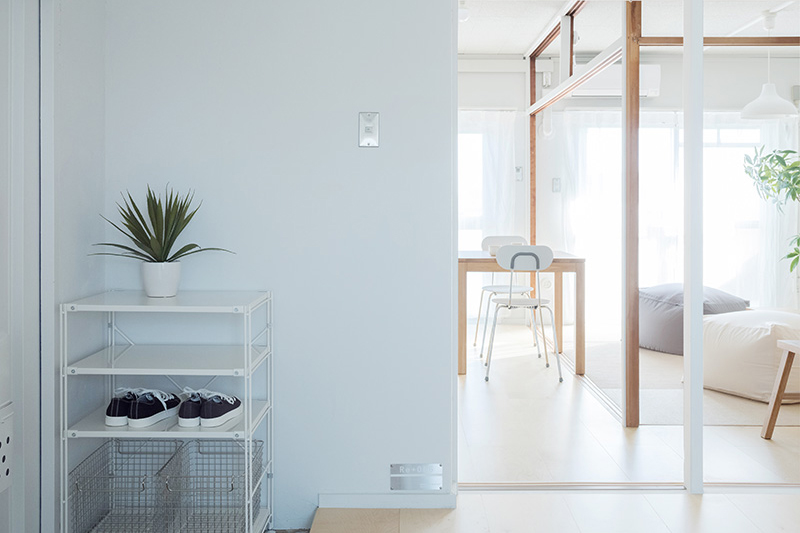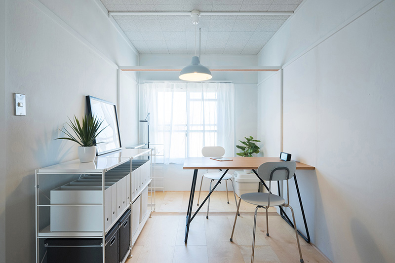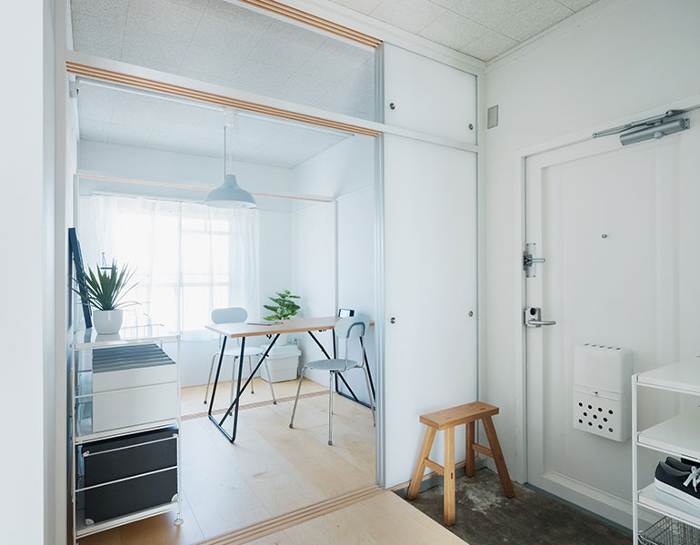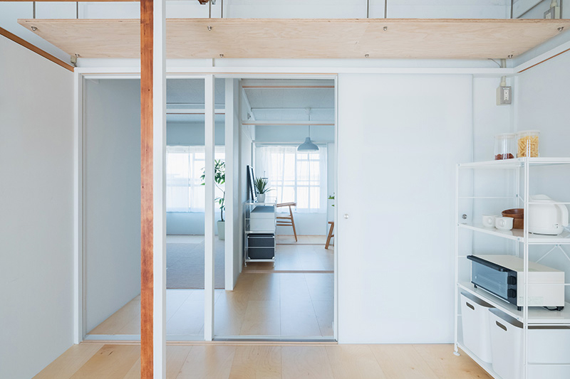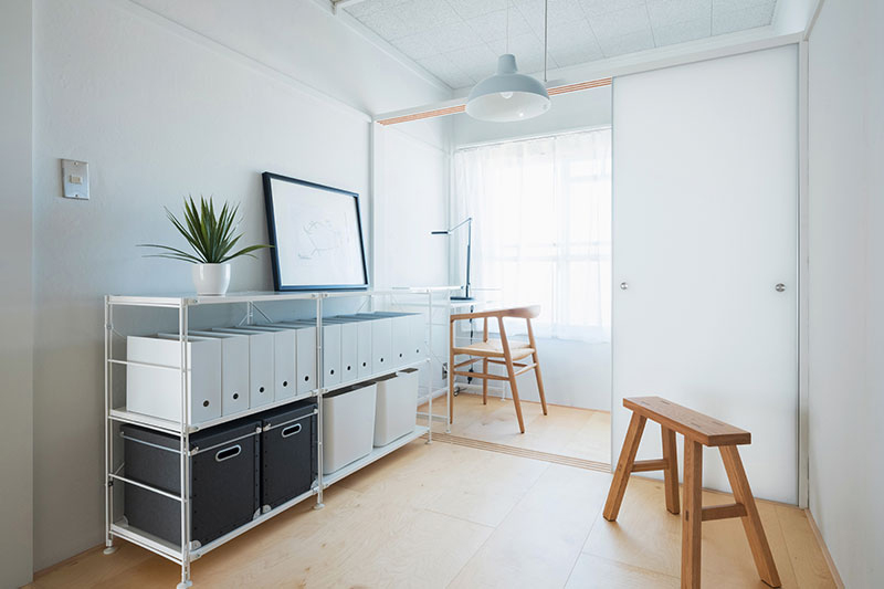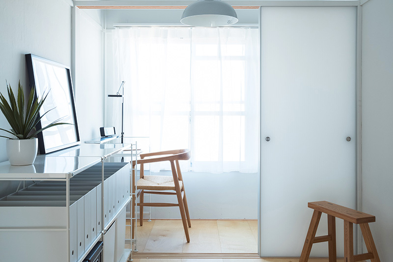 玄関横の狭い個室を、ふすまを移動させることで部屋の広さが可変する多目的スペースとしました。ふすまを窓側に移動させると狭小の仕事に集中できるテレワークスペースになり、手前は玄関と一体の収納になります。一方、ふすまを玄関側に設置し、閉じることで寝室として利用することもできます。ふすまを全部開放すると玄関と一体の広いアトリエ空間となり、ふすまを移動することで空間を変化させることができます。