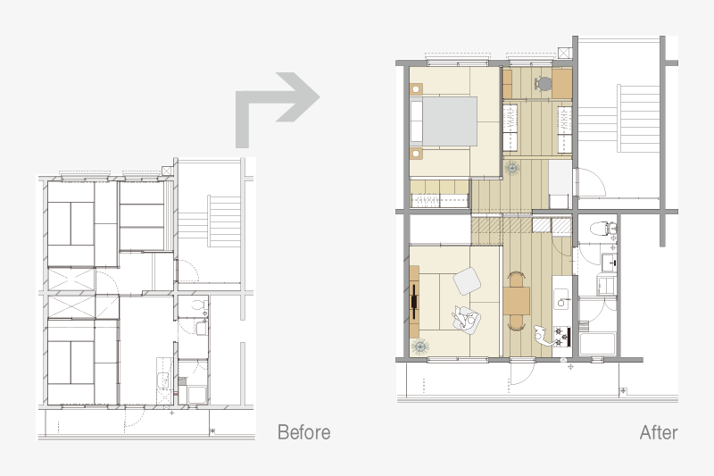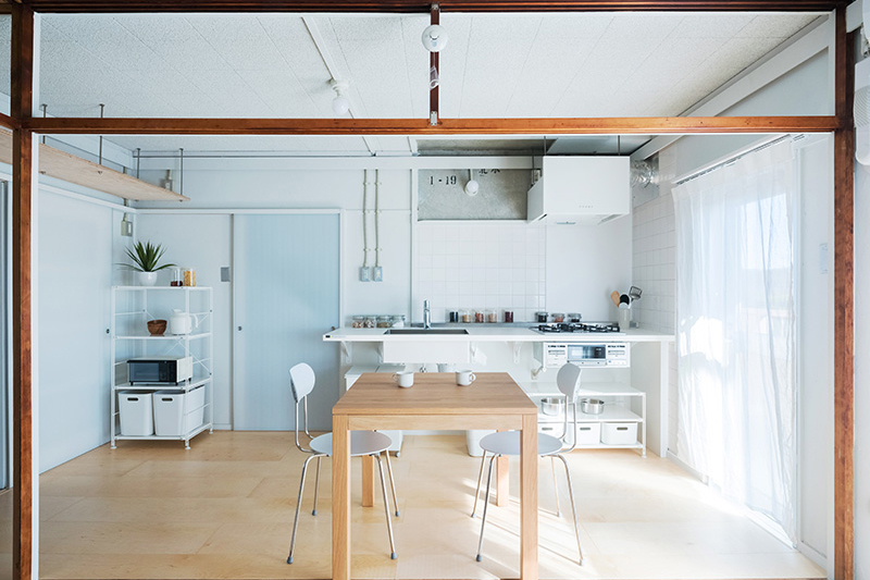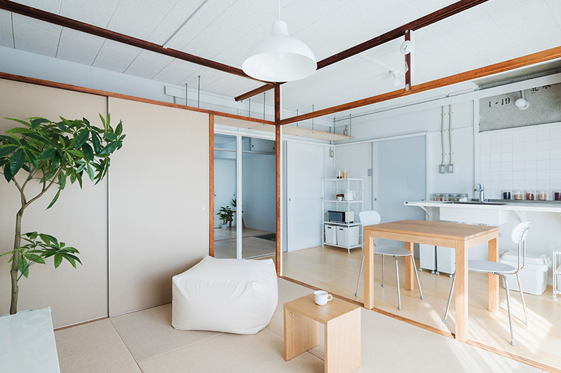 元々南北を分断しボトルネックになっていた物入を撤去し、空間を広く繋げました。半透明ふすまで光が通り抜けます。