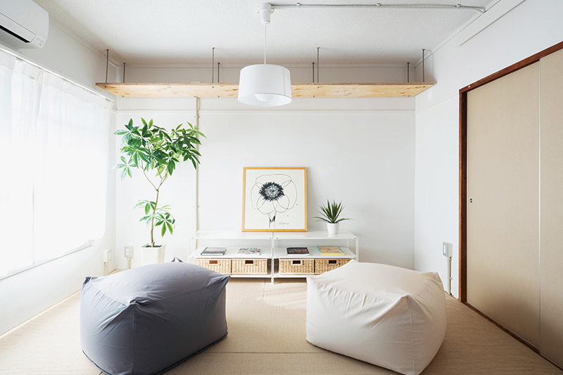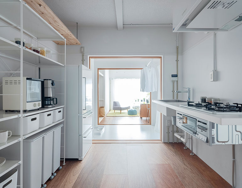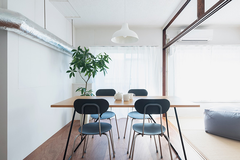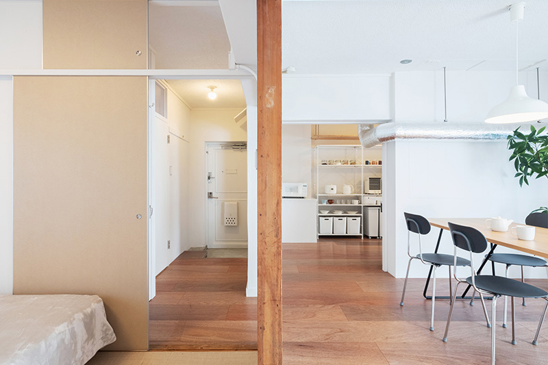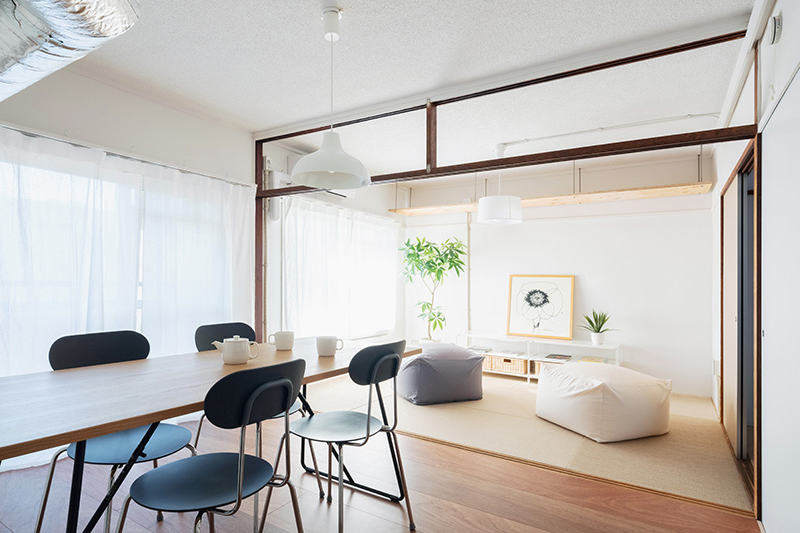 キッチンを移設することで広いリビングダイニングとしました。ふすまを外すと寝室と繋がり風が通り抜けます。
