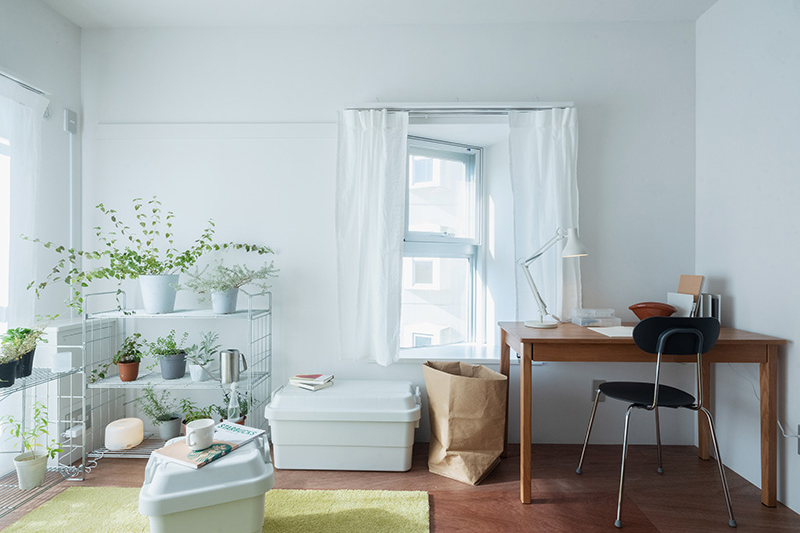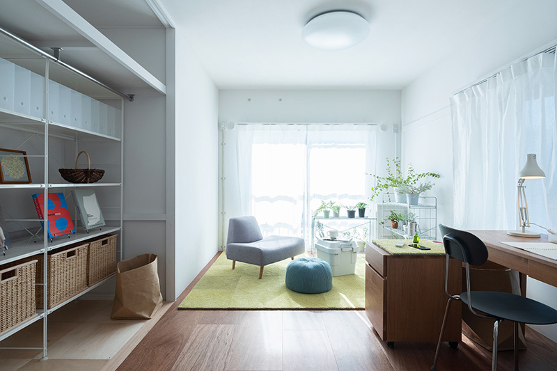 少子化や核家族化により需要が減っていた大型住戸を、広いテレワークスペース付きのプランとしました。もともと南面バルコニー面の先に一室増築されていた部分を、離れとし、生活音から少し距離をおいた部屋で仕事ができます。また、南面で日当たりがよく、半屋外として植栽を置たり芝生をイメージするカーペットを敷くことで屋外で仕事をしているようなリラックスした気分で仕事ができます。仕事以外でも室内キャンプなどにも活用できます。