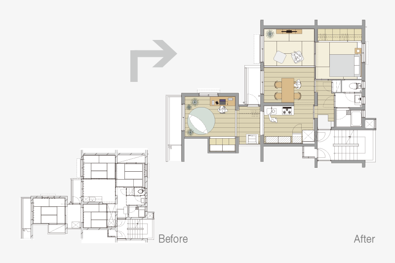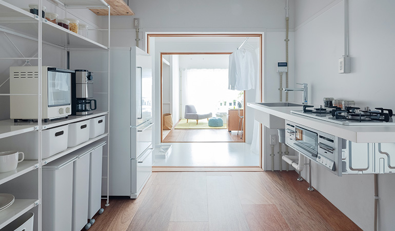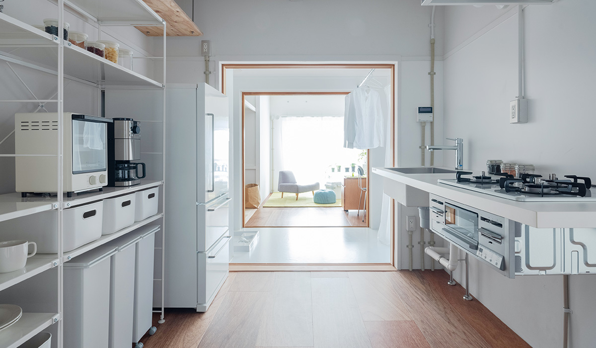 もともと窓のない閉鎖的な一室の壁とふすまを撤去することで広くて明るいキッチンとしました。