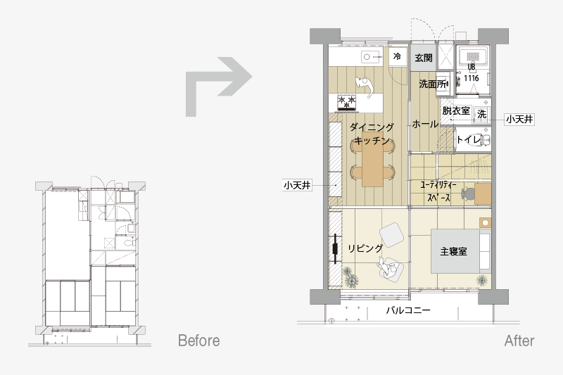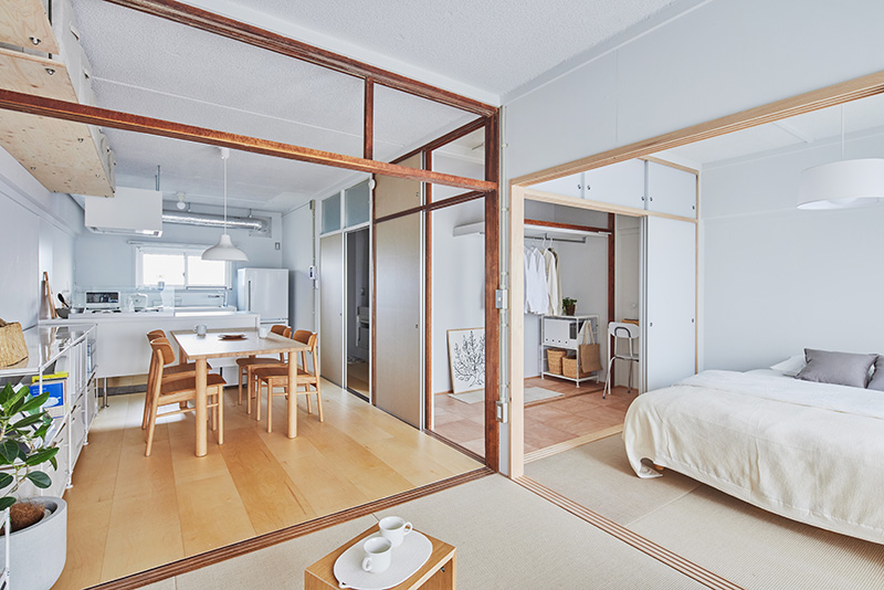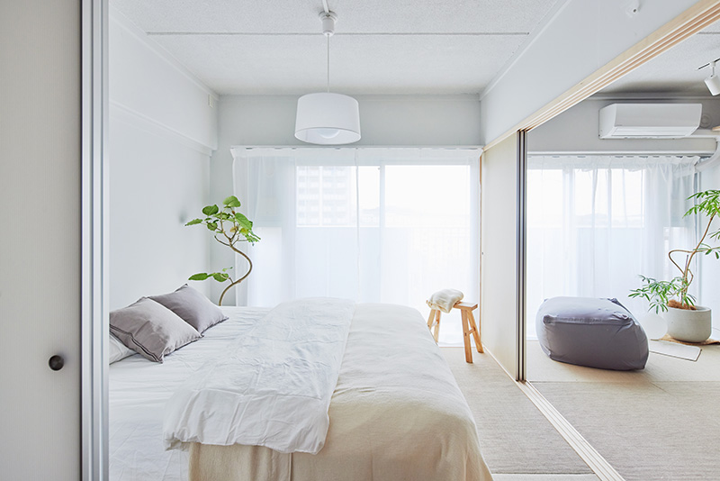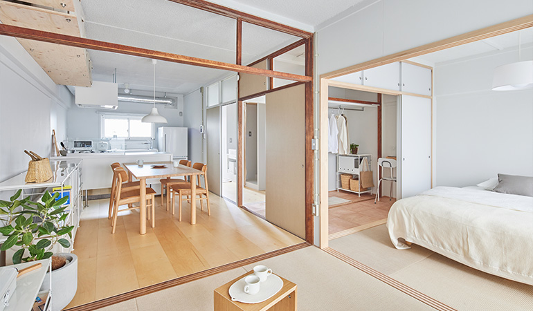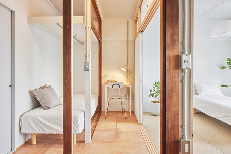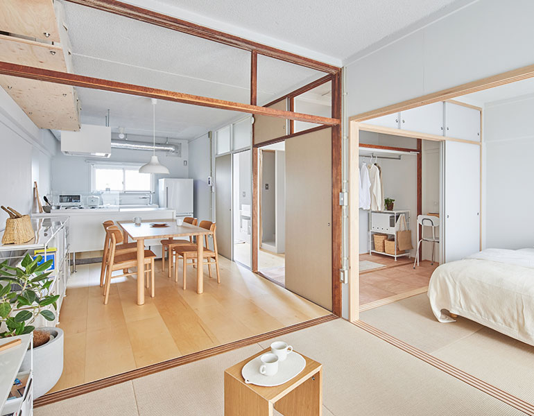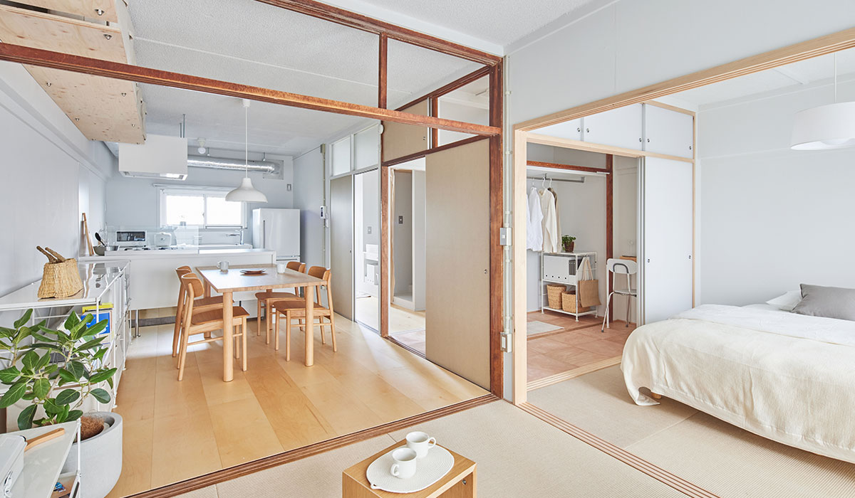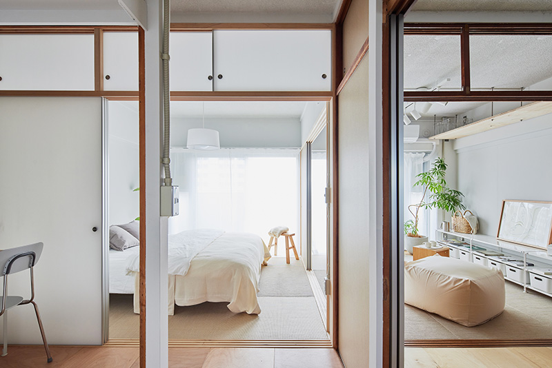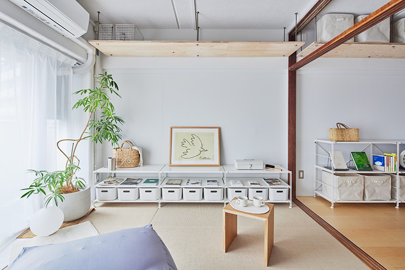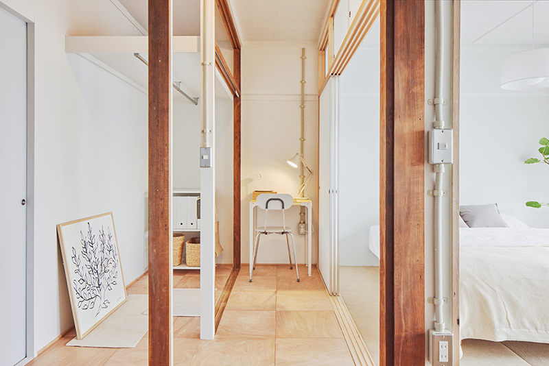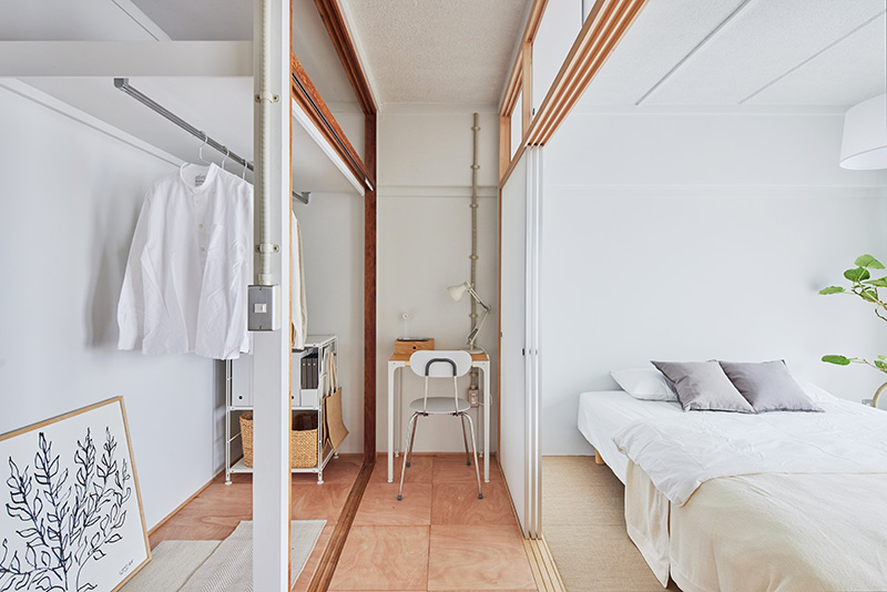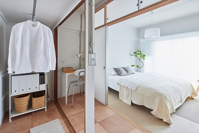 和室の一部を利用して、多用途に使えるユーティリティースペースをつくりました。ウォークインクローゼットとして洋服を収納したり、ふすまを閉じれば半個室の落ち着いたワークスペースにすることもできます。