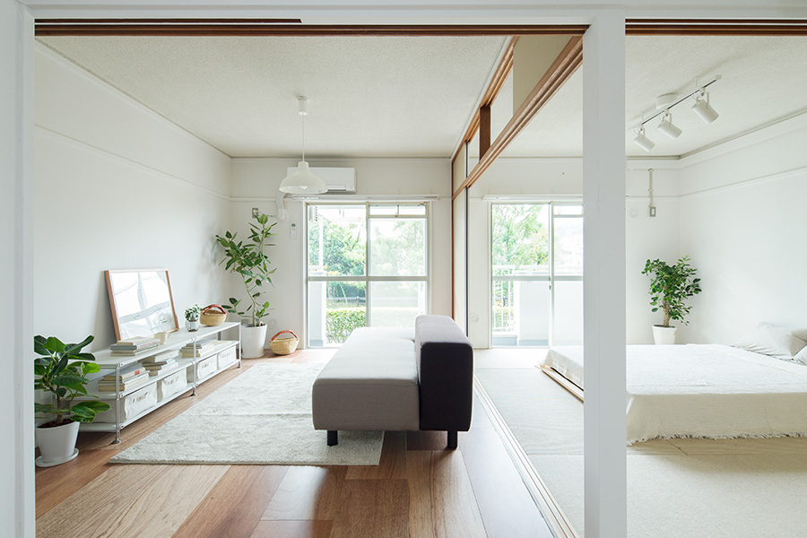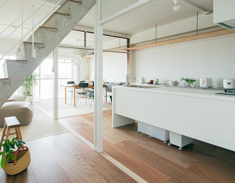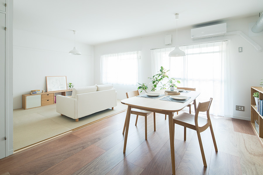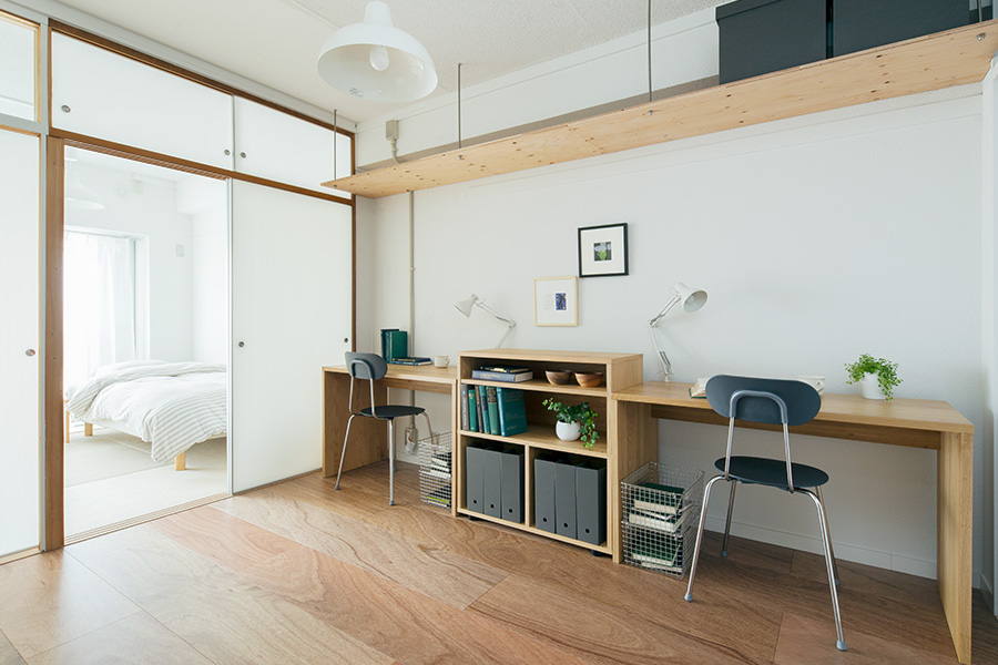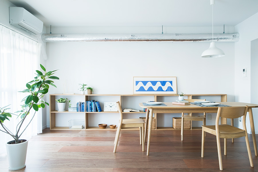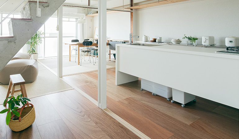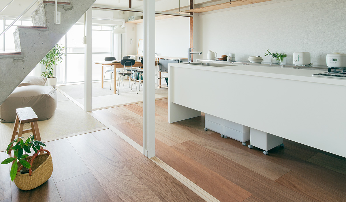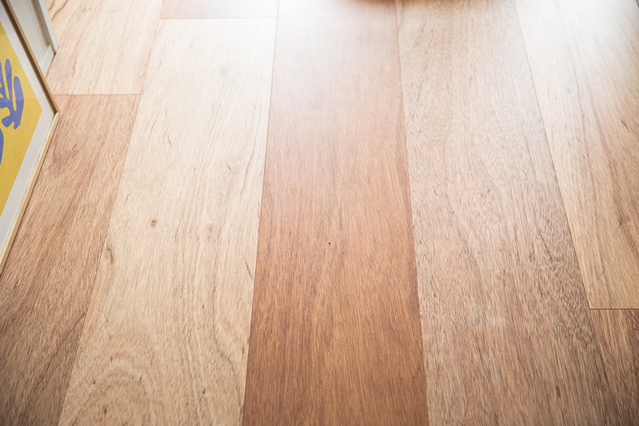 ラワン合板フローリングは、この表面に貼る材料を省略した、合板基材そのままの床材です。30×180cmの大判サイズで、クリア塗装で仕上げました。