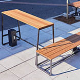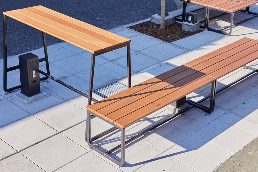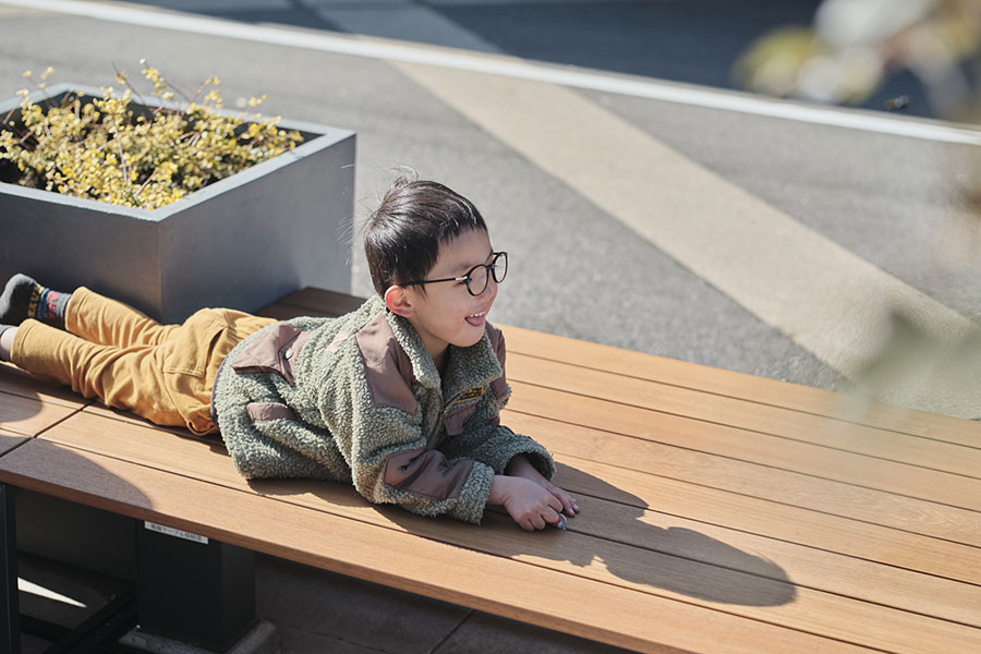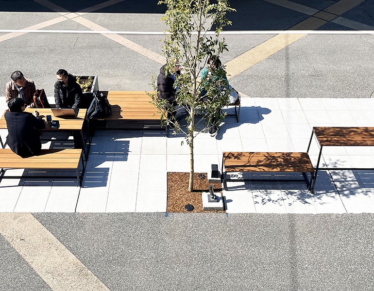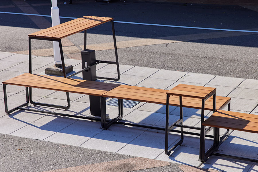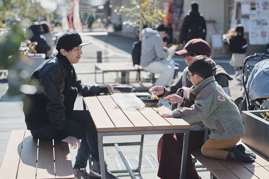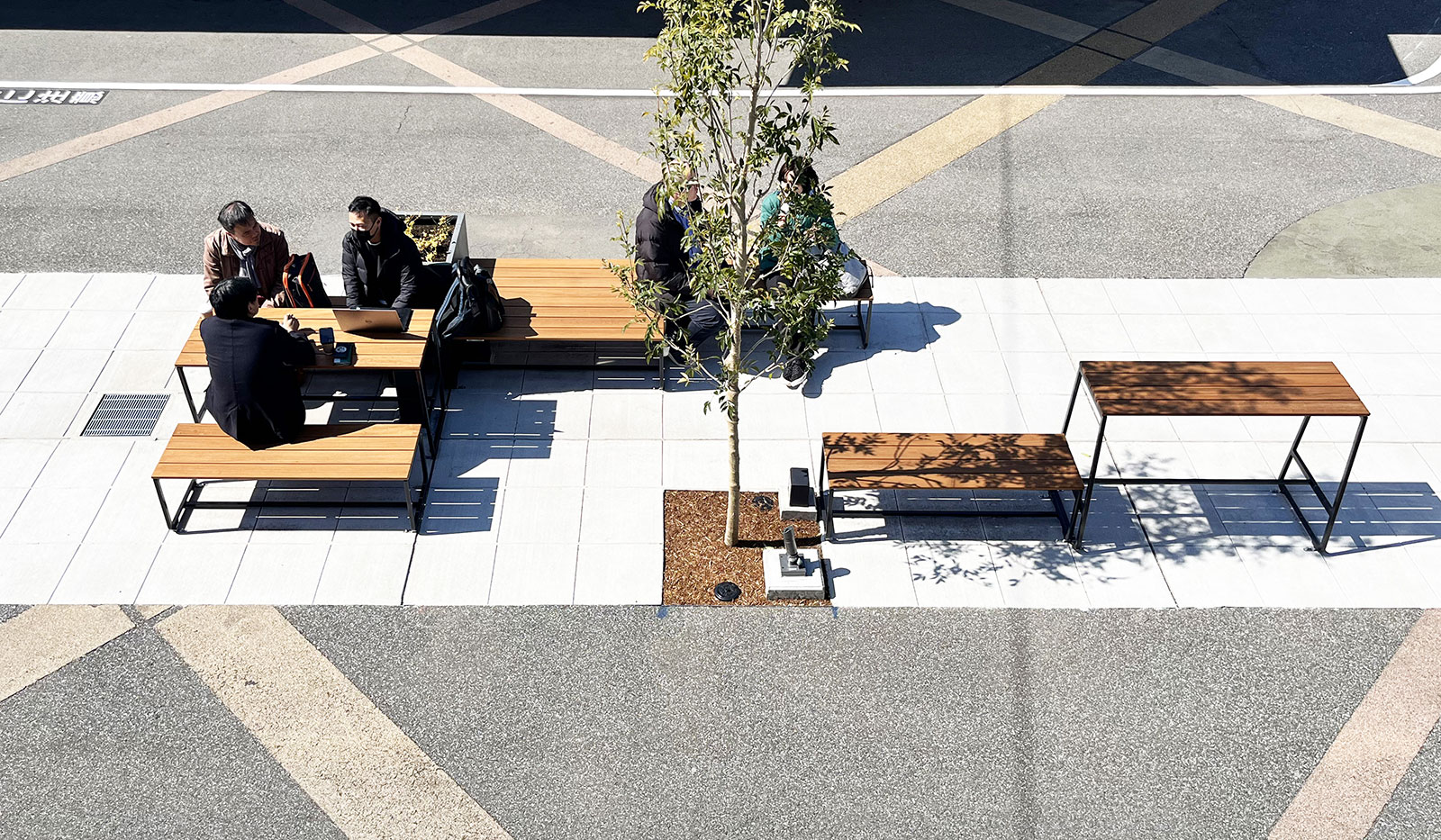 ベンチ同士をつなげて座面を広げたり、テーブルやハイカウンターは、最適な高さで食事や勉強、仕事、おしゃべりができます。利用する人々は思い想いに過ごすことで、屋外空間に心地よく過ごせる滞留場所を作り出します。