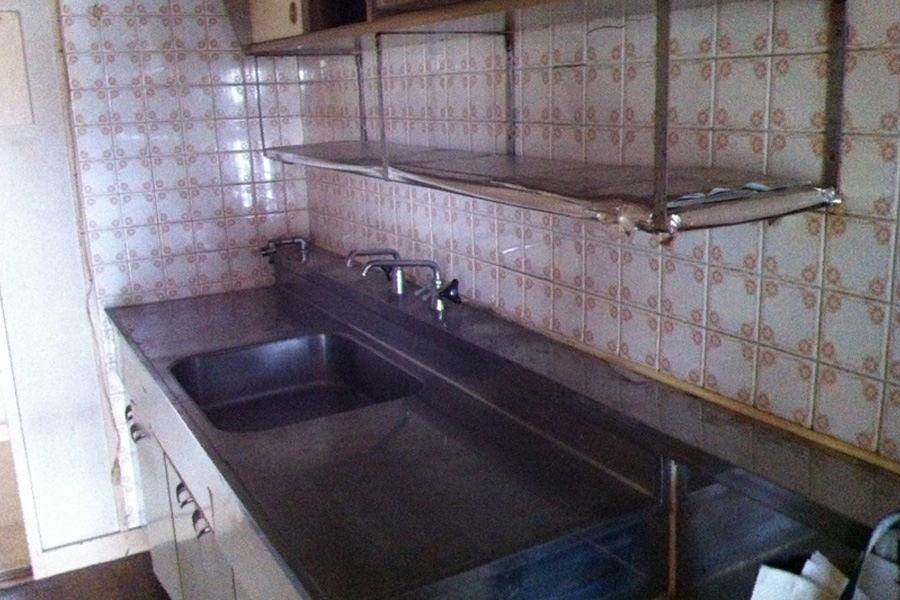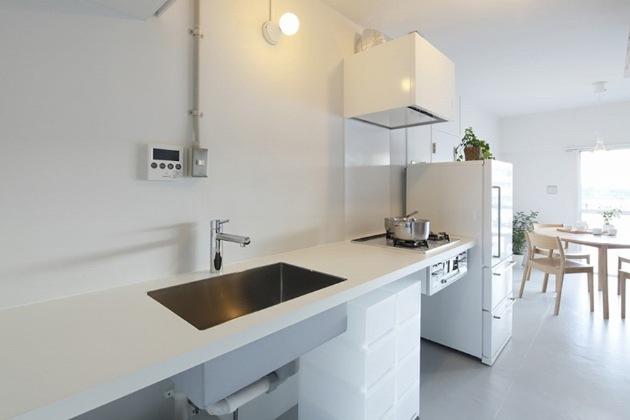 キッチンです。団地に合うように、食洗機やディスポーザーなどはつけず、必要最低限の機能をコンパクトにまとめたオリジナルの持出しキッチンです。特長的なのは、収納がないということです。それも住む人に自由に編集してもらう「余白」としています。