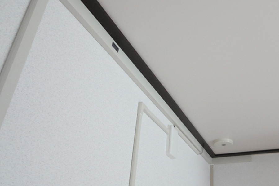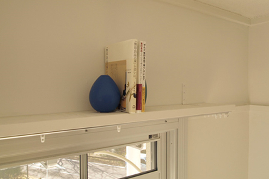 - 空間の有効活用としては、通常はカーテンレールをアルミサッシから持ち出していますが、棚を設け、そこにカーテンレールを設置しています。このことで、棚上に絵や小物を置いて部屋のアクセントにできるようにしています。右の写真はさらにその進化形で、持ち出した板とサッシをぐるりと囲むように設置しました。そうすることで、サッシ上は棚として、サッシ下はミニデスクとして、またベンチとしても使用できるものを今年度は新たに開発しています。