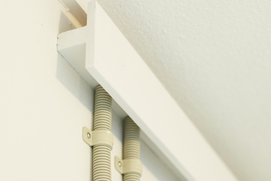 そこで、電気配線を整理し、リノベーション空間の雰囲気に合うカバーをつけました。横引きは木製カバー、縦方向はPF管とルールをつくることで、どのプランでも同じテイストを保つことができるようにしました。